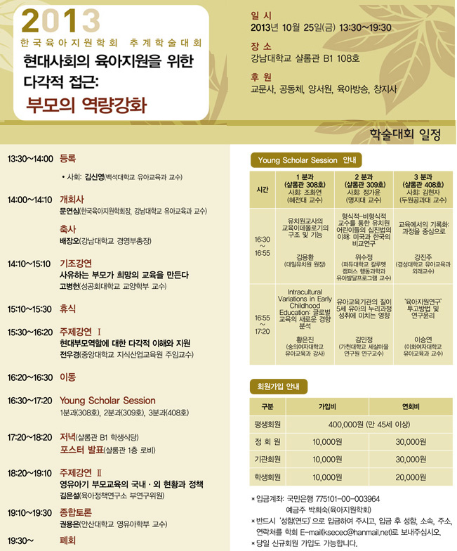 한국육아지원학회에서 2013년 추계학술대회를  『현대사회의 육아지원을 위한 다각적 접근: 부모의 역량강화』이란