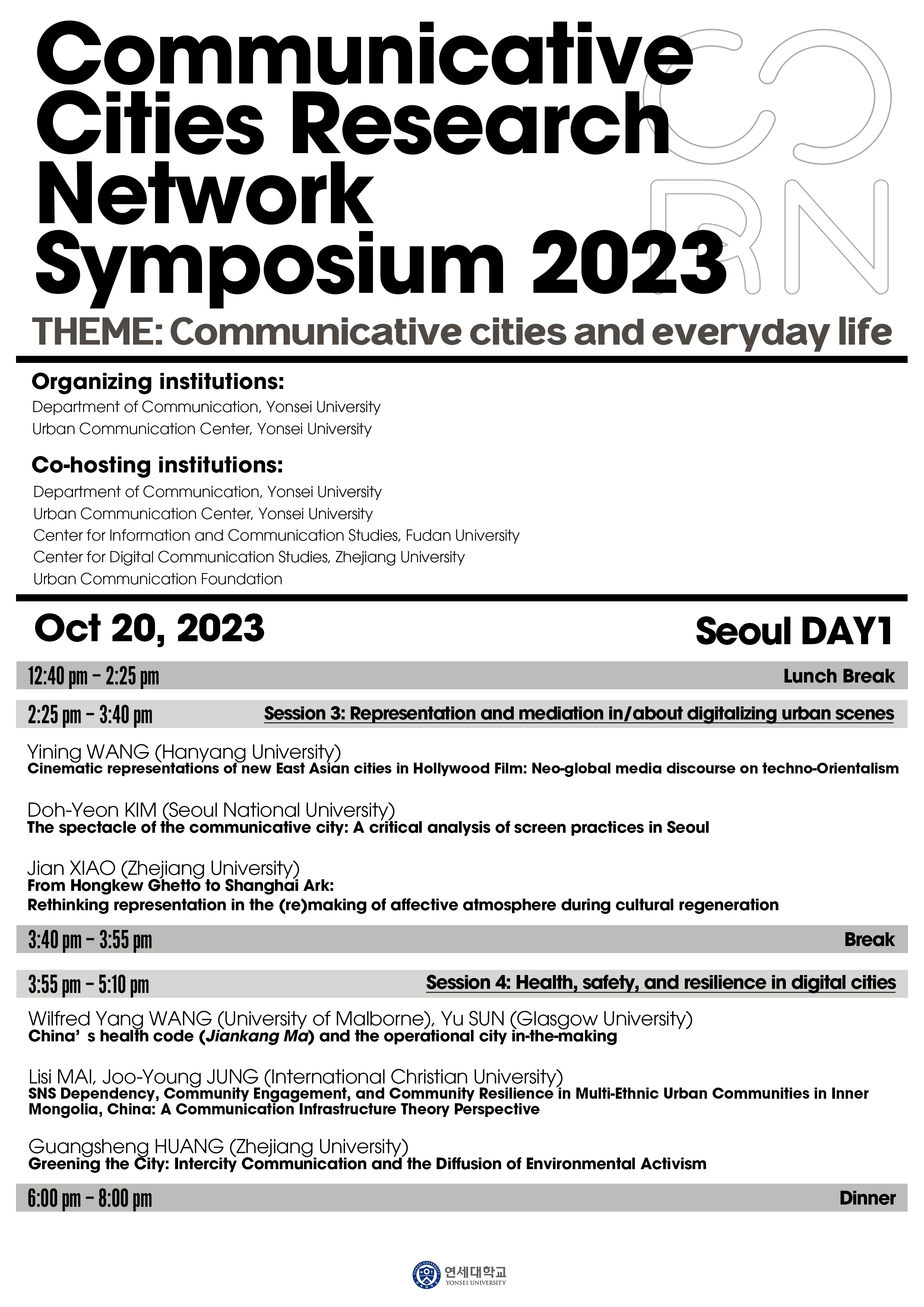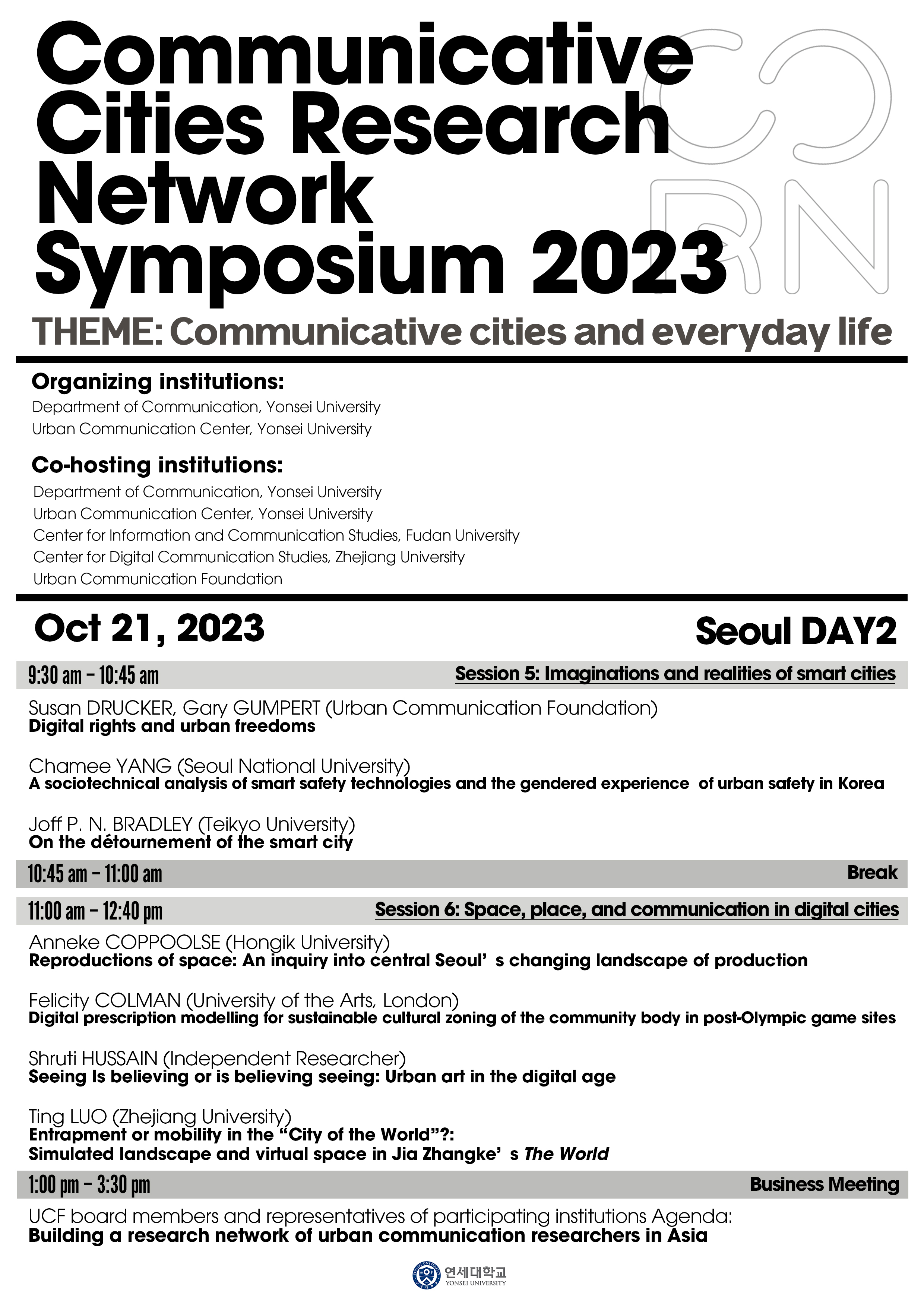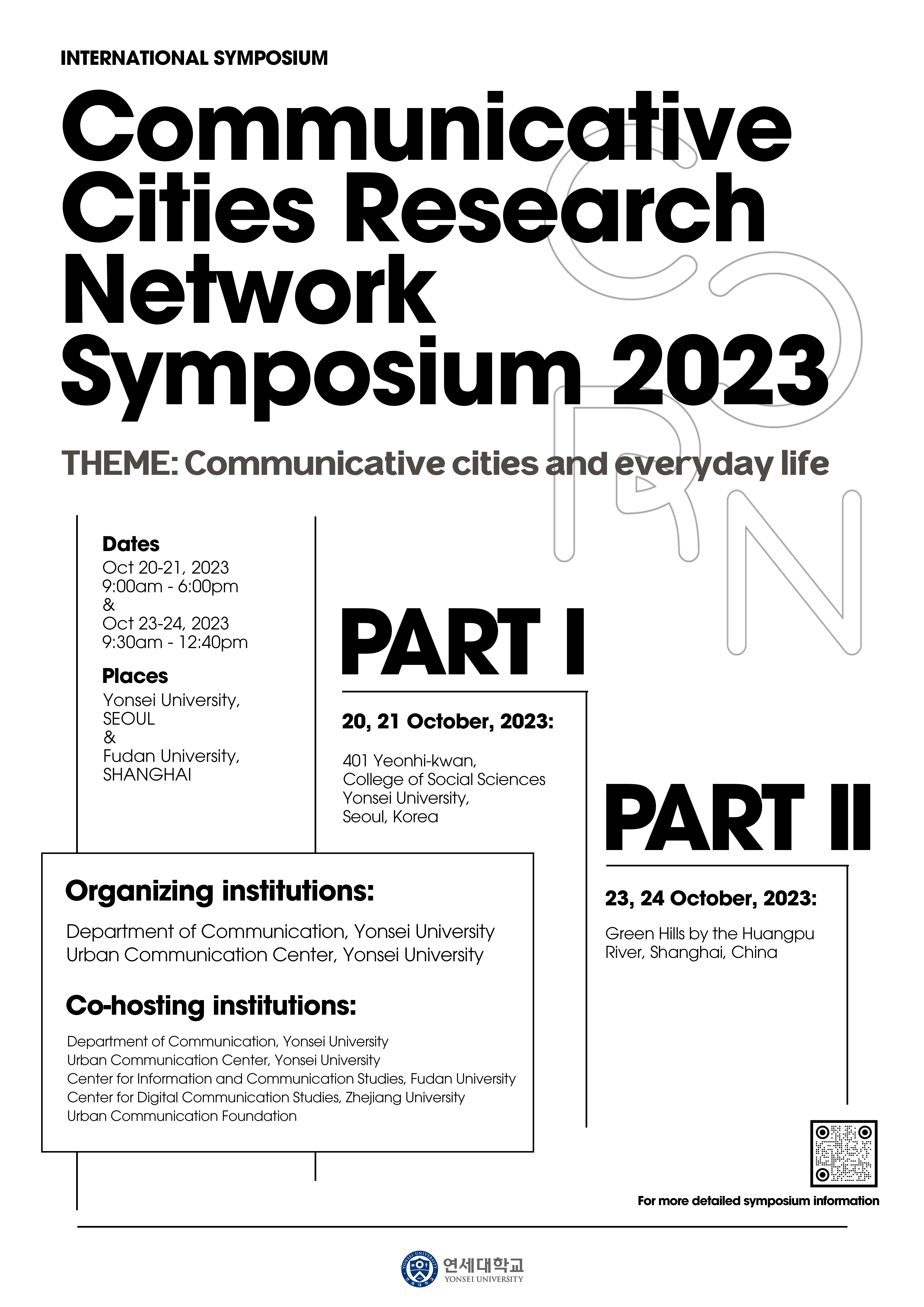 2. 연세대학교 언론홍보영상학부와 도시커뮤니케이션센터에서 10월 20일(금)~21일(토) 양일간 국제 심포지움 <Communicative Cities Research Network Symposium 2023>을 개최합니다. 다음과 같이 안내해 드리니, 회원 여러분의 많은 관심 바랍니다.
