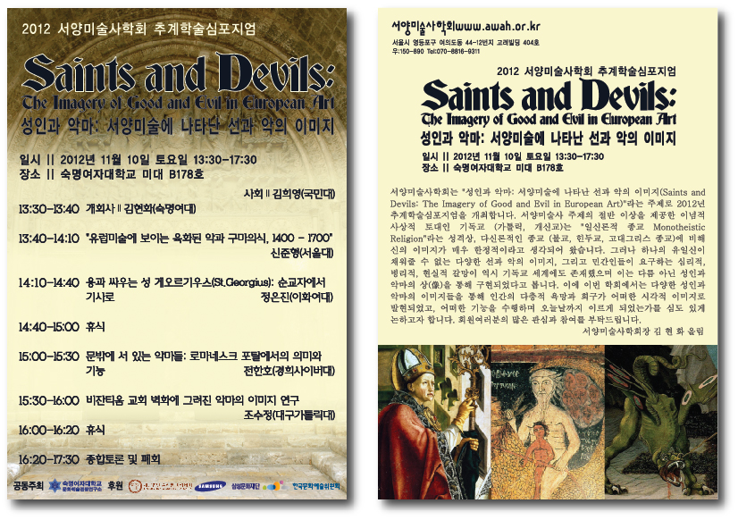 서양미술사학회는 '성인과 악마: 서양미술에 나타난 선과 악의 이미지(Saints and Devils: The Imagery of Good and Evil in European Art)'라는 주제로 2012년 추계학술심포지엄을 개최합니다. 서양미술사 주제의 절반 이상을 제공한 이념적 사상적 토대인 기독교 (가톨릭, 개신교)는 '일신론적 종교 Monotheistic Religion'라는 성격상, 다신론적인 종교 (불교, 힌두교, 고대그리스 종교)에 비해 신의 이미지가 매우 한정적이라고 생각되어 왔습니다. 그러나 하나의 유일신이 채워줄 수 없는 다양한 선과 악의 이미지, 그리고 민간인들이 요구하는 심리적, 병리적, 현실적 갈망이 역시 기독교 세계에도 존재했으며 이는 다름 아닌 성인과 악마의 상(像)을 통해 구현되었다고 봅니다. 이에 이번 학회에서는 다양한 성인과 악마의 이미지들을 통해 인간의 다층적 욕망과 희구가 어떠한 시각적 이미지로 발현되었고, 어떠한 기능을 수행하며 오늘날까지 이르게 되었는가를 심도 있게 논하고자 합니다. 회원여러분의 많은 관심과 참여를 부탁드립니다.