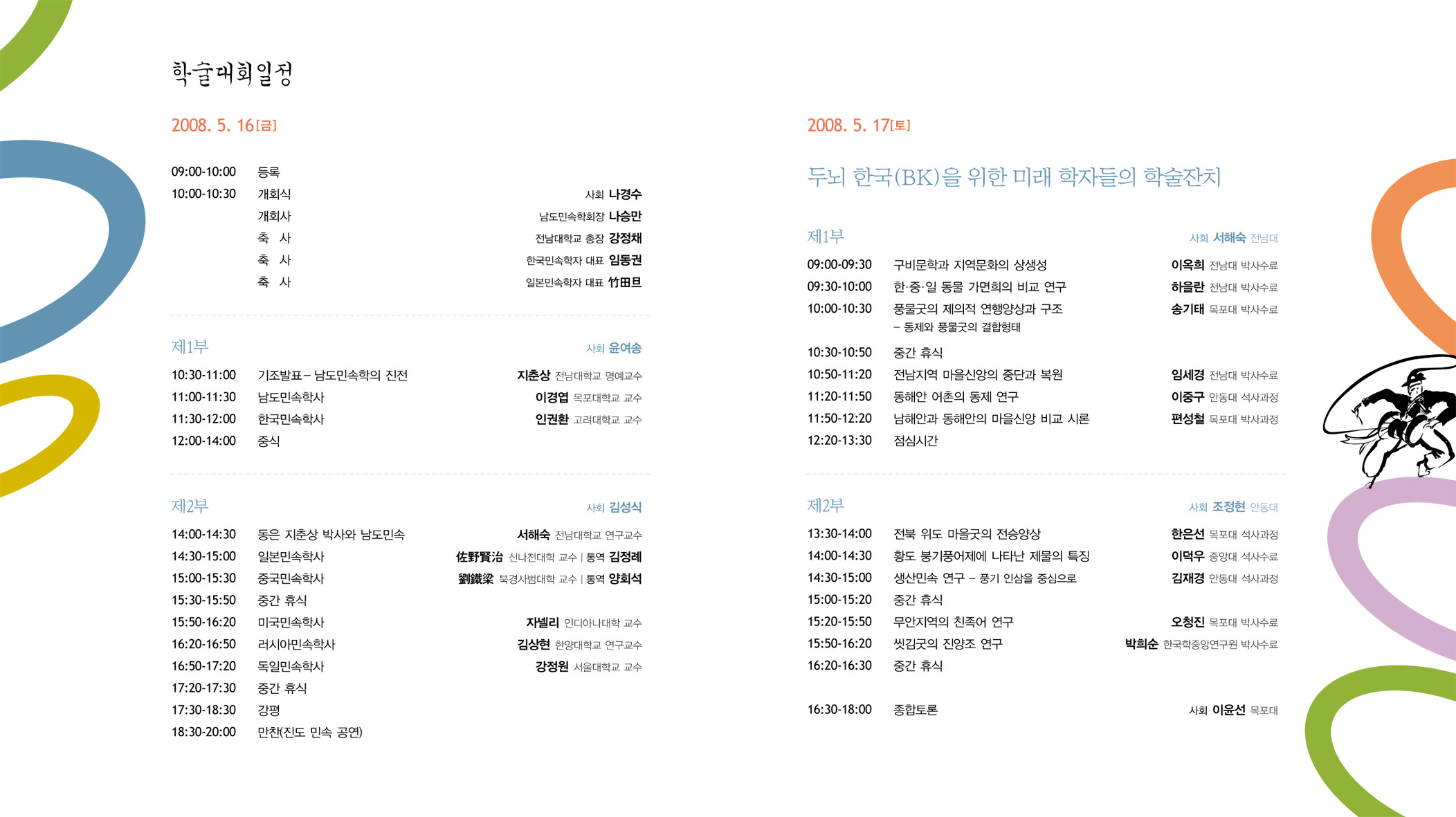한국민속학회 회원 여러분!안녕하세요. 총무이사 이승수입니다.아래와 같이 남도민속학회 국제학술대회를 개최하오니많은 관심 바랍니다.일시: 2008년 5월 16일(금)~5월 17일(토)장소: 전남대학교 인문과학대학 1호관 114호실기타 자세한 내용은 첨부파일을 참조 바랍니다.총무이사 이승수 배상.