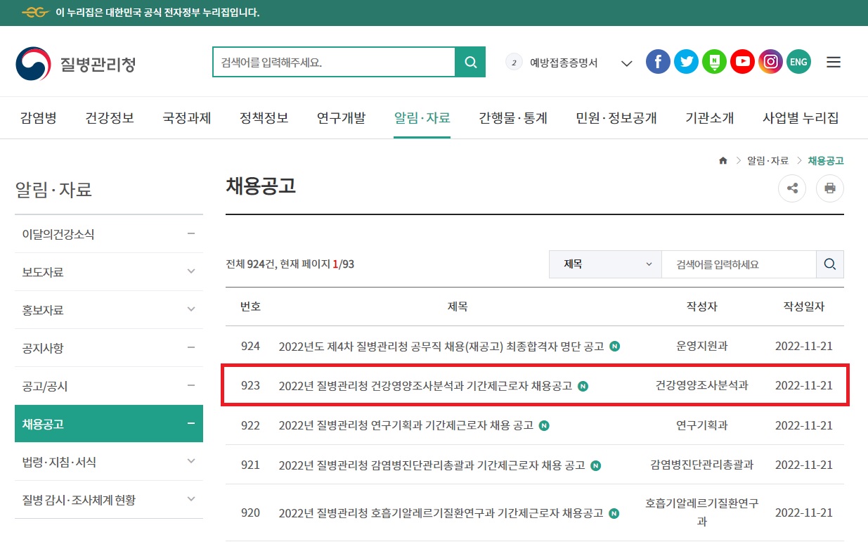 채용공고는 아래 내용으로 11월 21일(월)부터 질병관리청 홈페이지에 공고되었으며, 11월 29일(화)까지 원서접수 합니다.