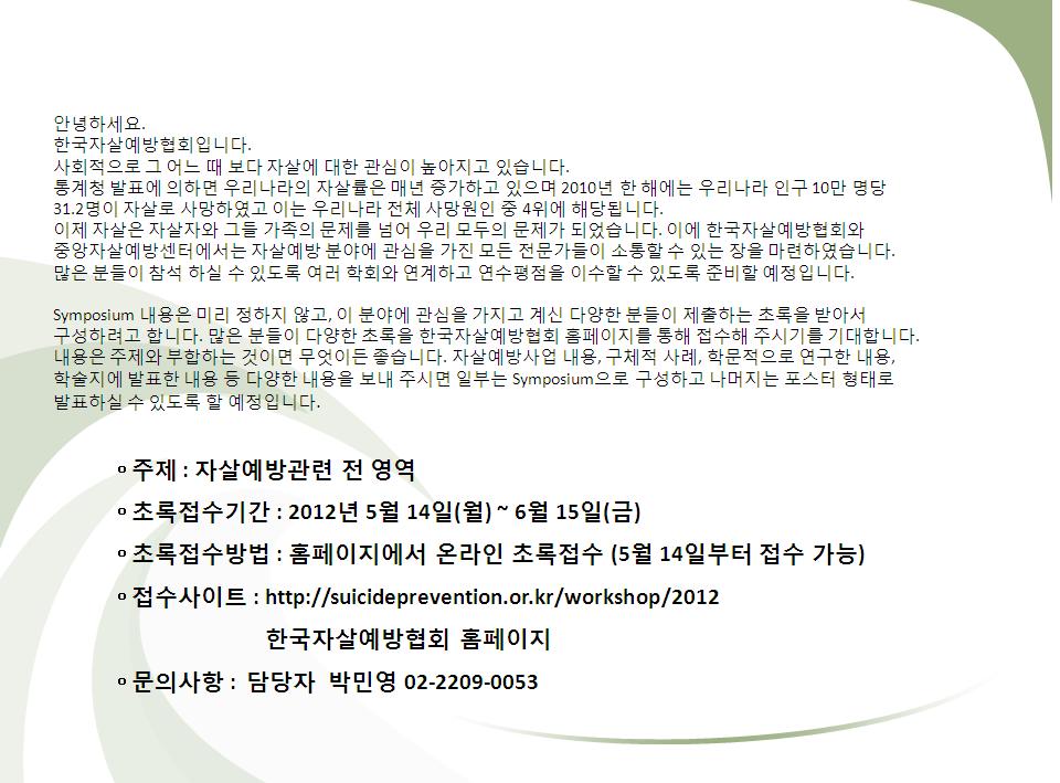 ◦ 접수사이트 : http://suicideprevention.or.kr/workshop/2012
