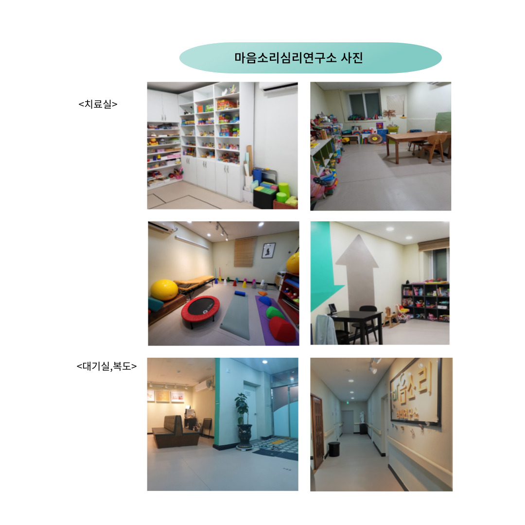 지역내에서 치료실에 대한 이미지가 좋고,치료사분들의 이직이 많이 없는 연구소이며, 치료세션안에서의 치료사의 권리를 중시하고 대기실과 치료실의 정확한 분리로 치료에 집중할 수있는 환경을 만들고 있습니다.