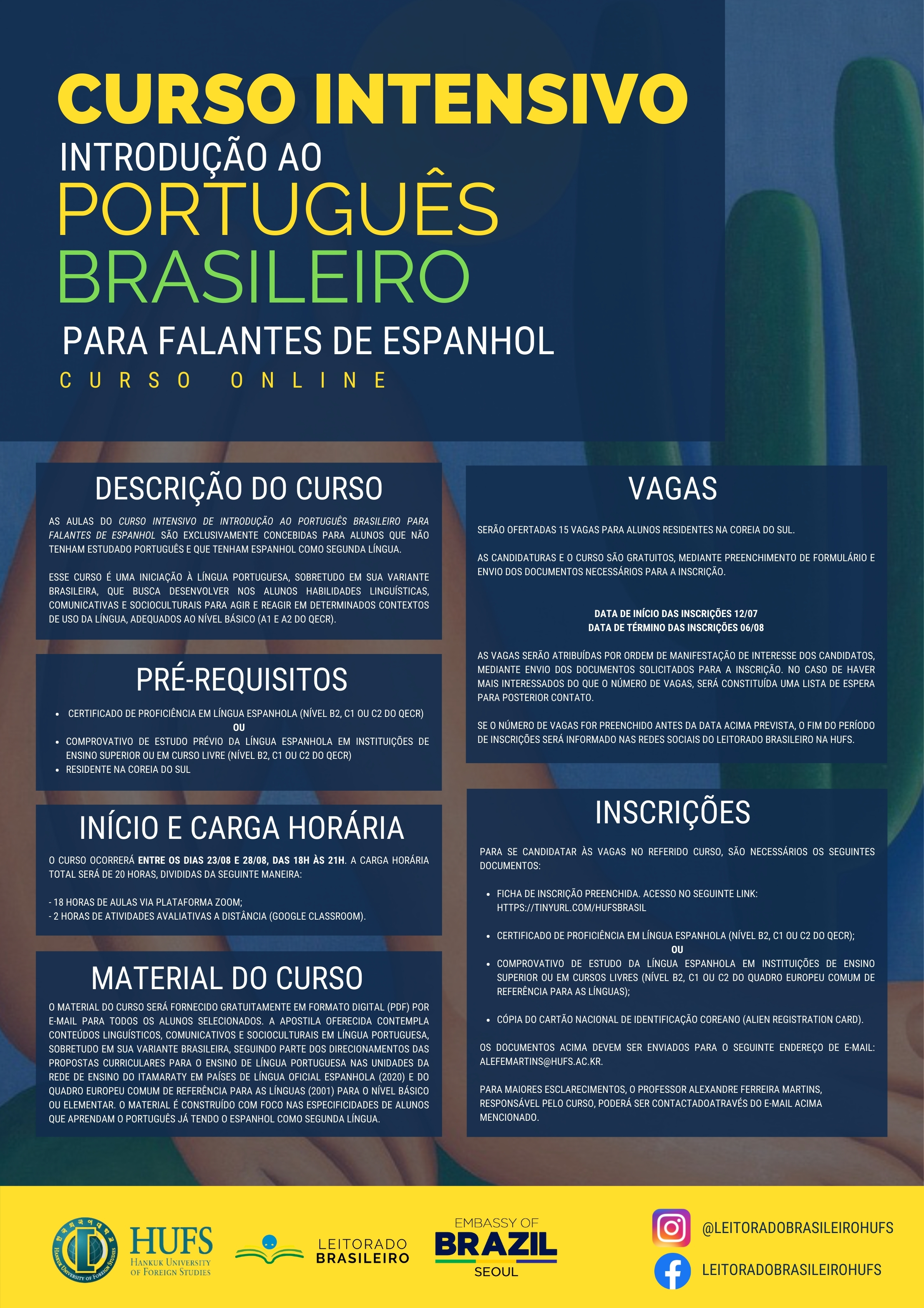 한국외국어대학교 포르투갈어과는 주한 브라질대사관과 공동으로 2021년 여름 방학에 스페인어 전공 학생을 대상으로 아래와 같이 브라질식 포르투갈어 입문 집중 과정 (온라인 과정)을 개설해 운영할 계획입니다관심있는 학생들의 많은 참여 부탁드립니다.