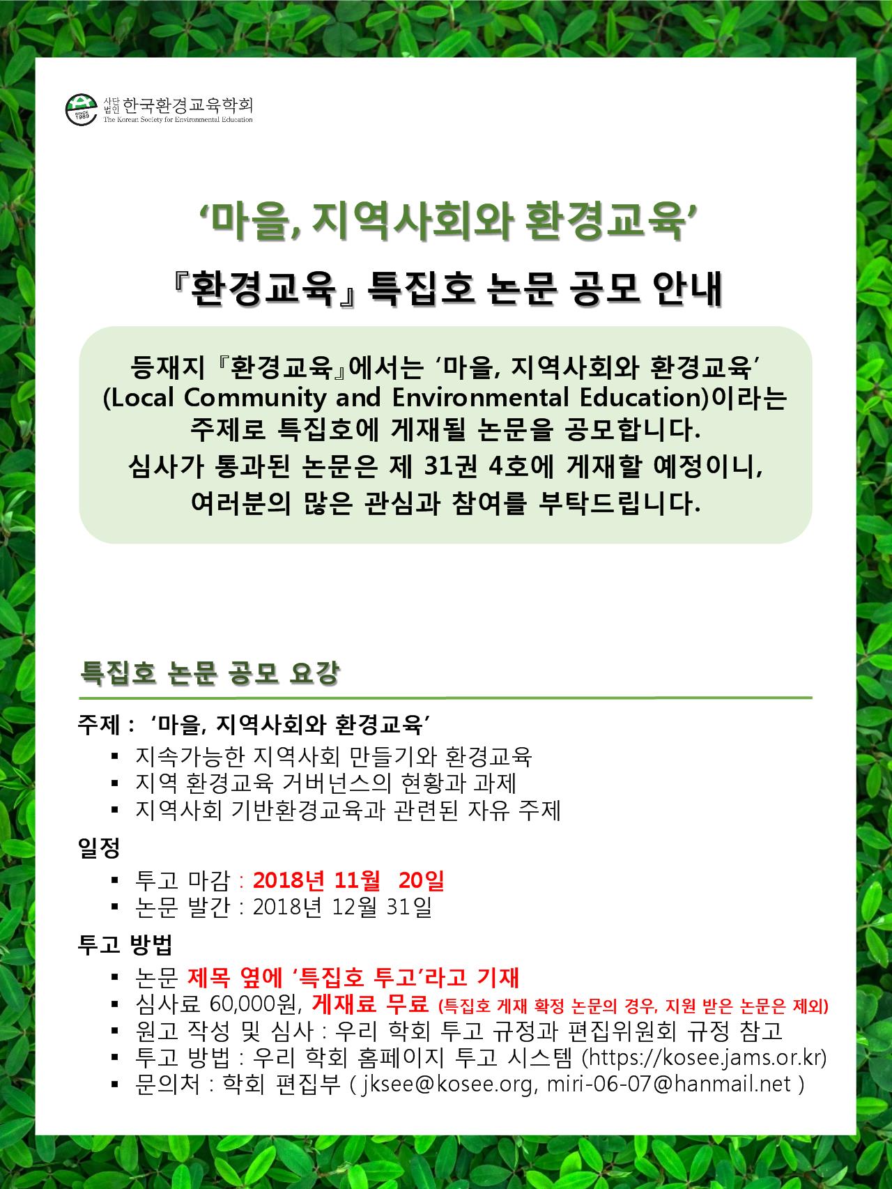 등재지 [환경교육]에서는 '마을, 지역사회와 환경교육'이라는 주제로 특집호에 게재될 논문을 공모합니다. 심사가 통과된 논문은 제 31권 4호에 게재할 예정이니, 여러분의 많은 관심과 참여를 부탁드립니다.
