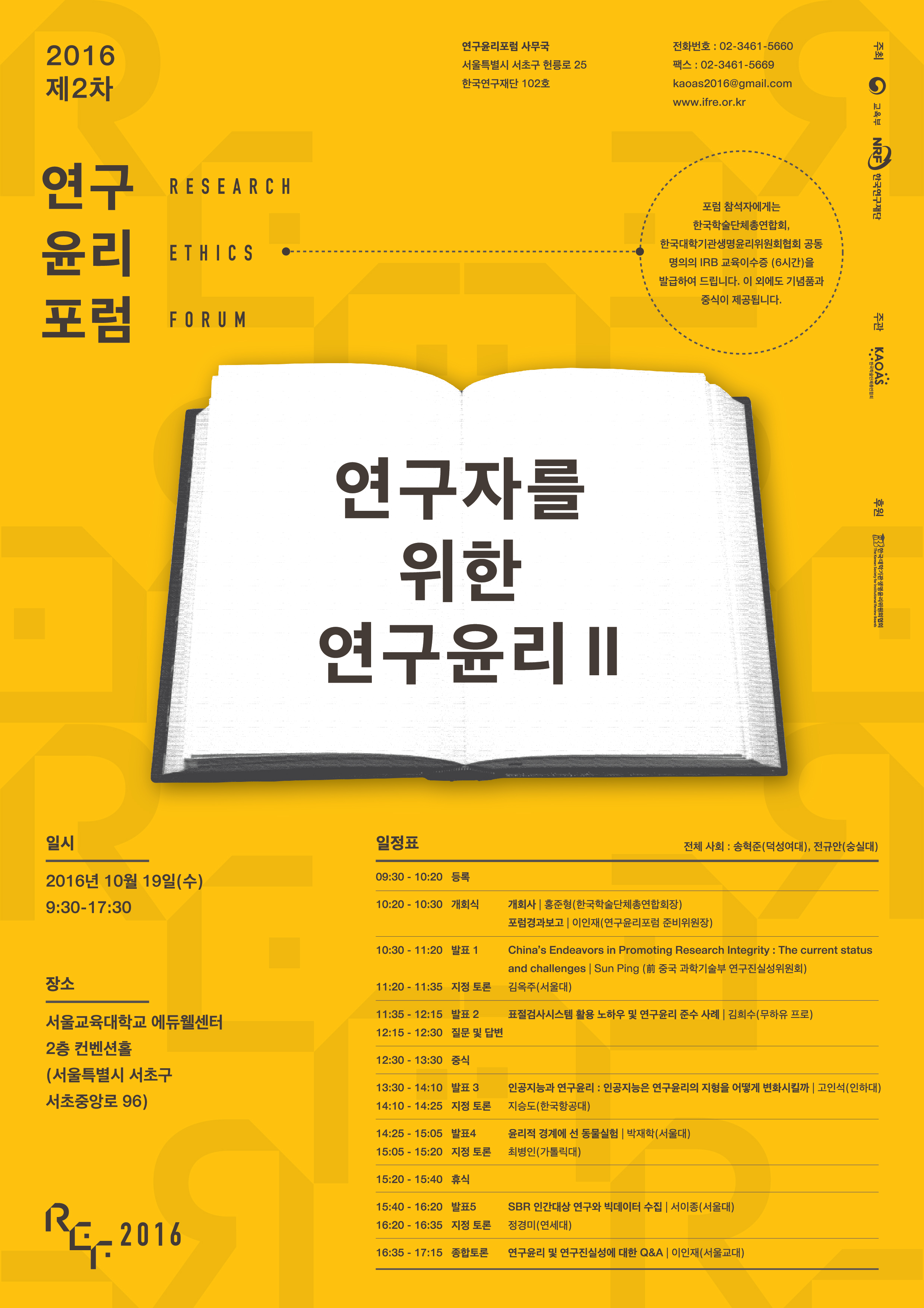 포럼의 모든 과정에 참여하신 분에게는 한국학술단체총연합회(KAOAS), 한국대학기관생명윤리위원회협회(KSIRB)가 공동으로 IRB 교육이수증(6시간)을 발급합니다. 교수, 연구원, 대학원생, 학회 편집위원장, IRB 위원장, IRB 위원, IRB 행정간사 등 관심 있는 분들의 많은 참여를 부탁드립니다.?