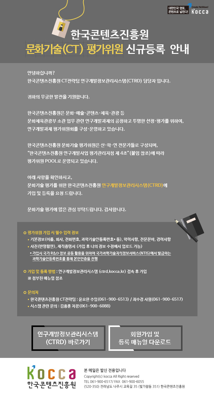 안녕하세요. 한국디지털콘텐츠학회 사무국입니다. 한국콘텐츠진흥원 문화기술 평가 자문 운영을 위한 평가위원 가입 요청 관련 아래와 같이 안내드립니다. - 가입기간 : 2016. 5. 31 까지 가입 가능 . - 가입방법 : 문화기술 연구개발정보관리시스템 을 통해 가입 ○ 가입 관련 안내메일 발송 예정 ○ 담 당 : CT전략팀 윤요한 주임 (☎ 061-900-6513 / yonjohn@kocca.kr) CT전략팀 최수경 사원 (☎ 061-900-6517 / meomeo@kocca.kr) - 비 고 ○ 평가위원 가입 시 승인 대기로 전환 ○ 내부 승인 절차 진행 후 실제 과제 평가시 위촉 추진 감사합니다.