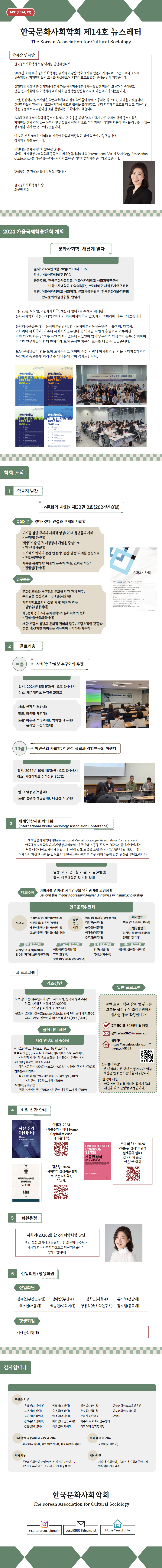 한국문화사회학회 뉴스레터 제14호(2024년 12월)가 나왔습니다.
