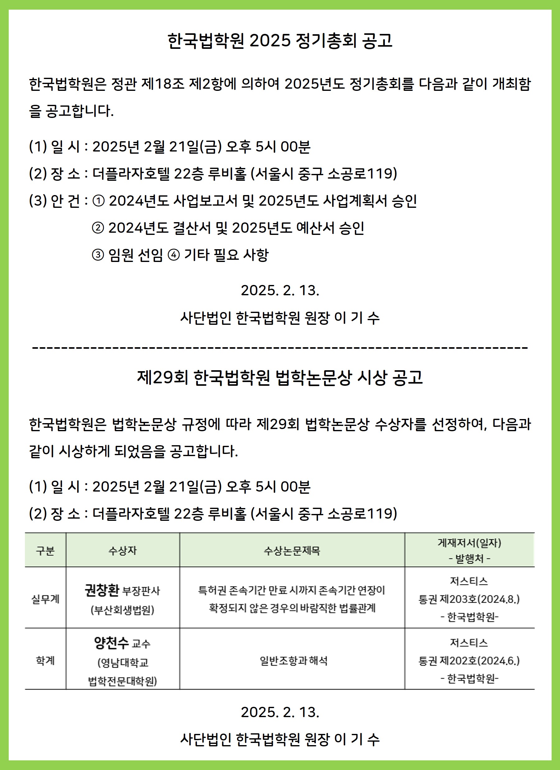 한국법학원 발행 등재학술지 '저스티스' 25년 4월호 원고 모집 공고 (~2/17 연장)