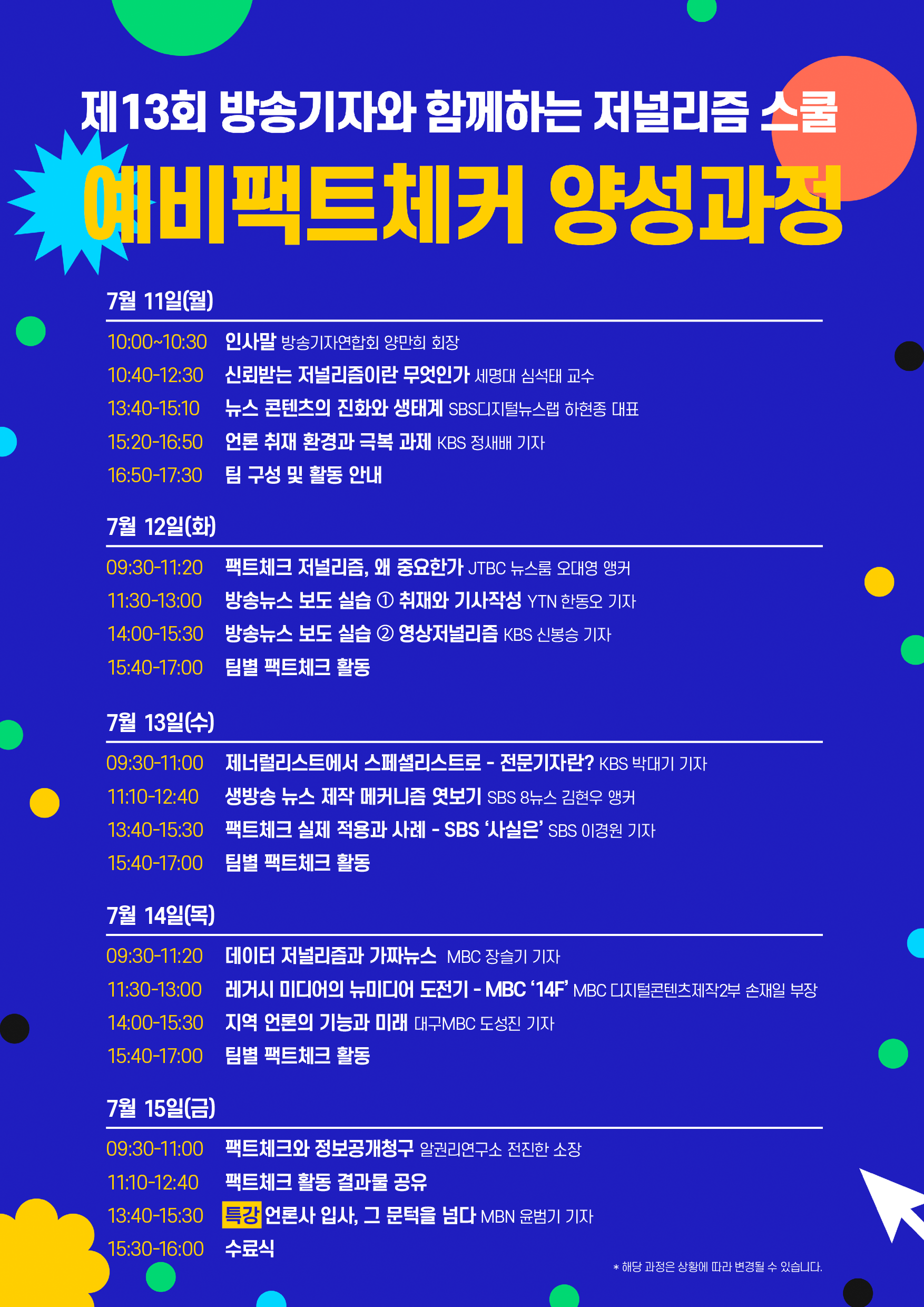 특히 올해 저널리즘 스쿨은 허위정보에 대한 경각심 고취와 팩트체크 방법 습득을 통한 미디어리터러시의 생활화, 방송보도의 미래를 위해 교육내용에 팩트체커 양성과정을 반영했습니다.