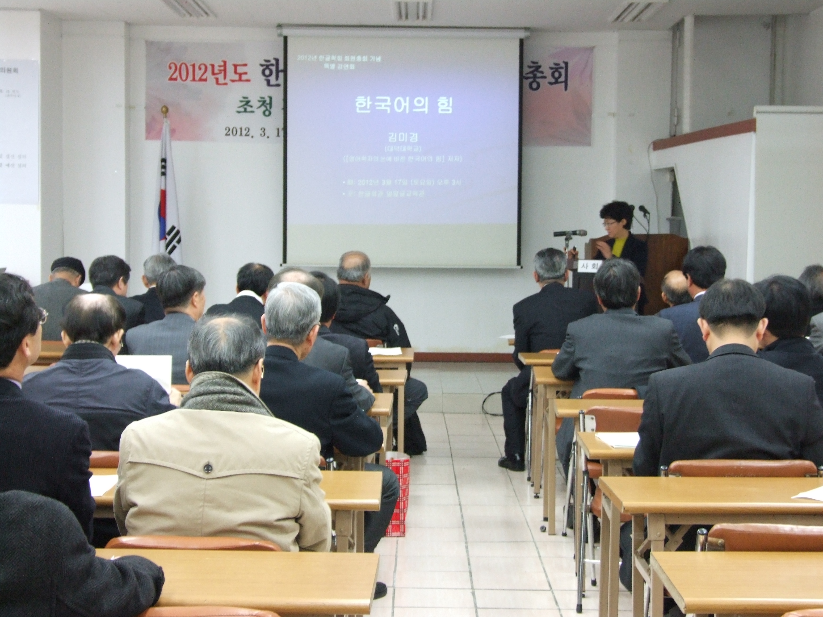 2012년 한글학회 정기 회원총회 기념으로 특강을 하고 있는 김미경 선생의 모습과 특강을 듣고 있는 참석자들의 모습.
