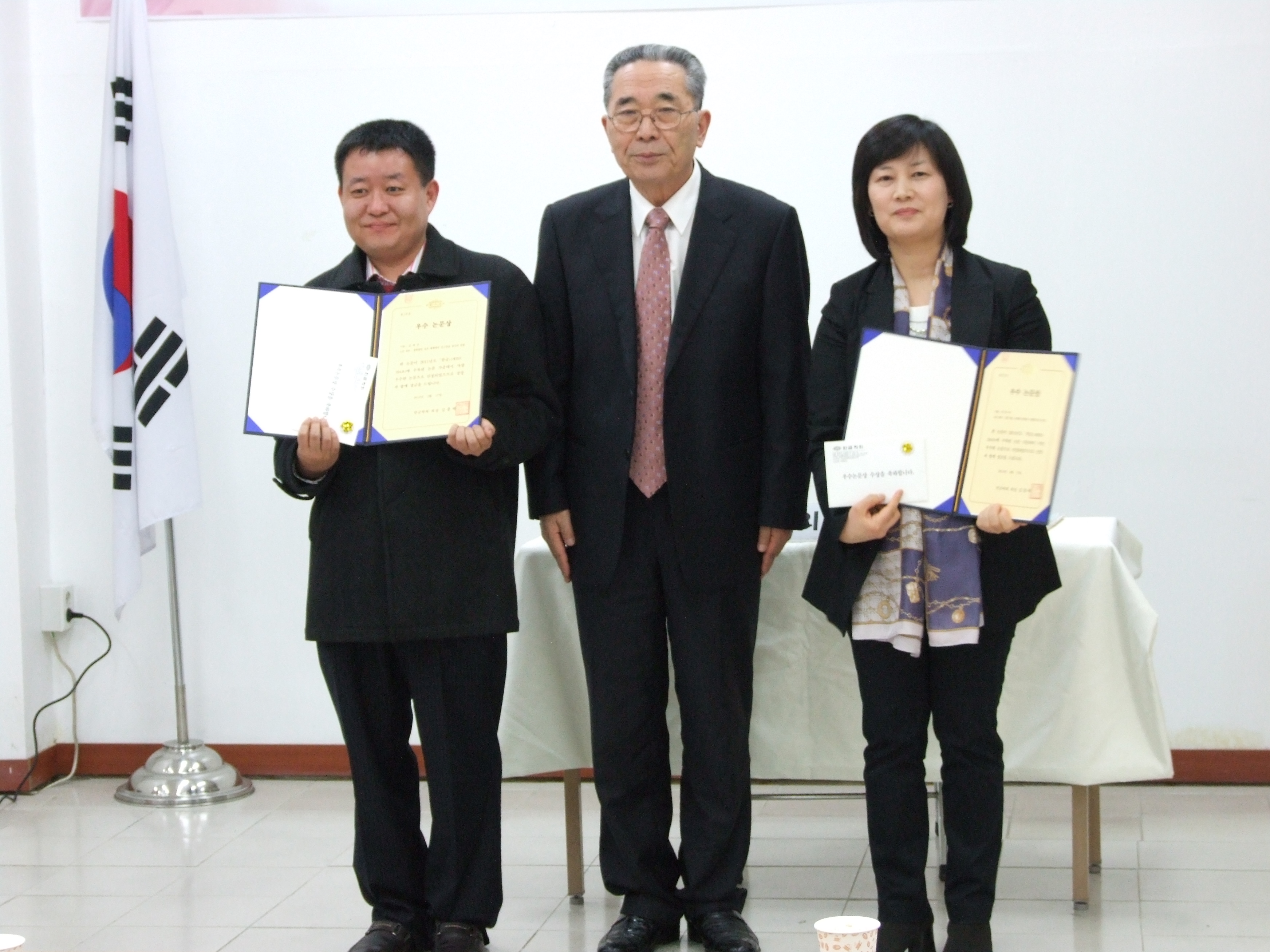 2012년 3월 17일(토) 오후 2시부터 한글회관 강당에서 열린 '2012년 한글학회 정기 평의원회/회원총회'에서 우수논문상을 받은 김세진(충남대), 서은아(상명대) 님과 김종택 회장님의 기념사진.