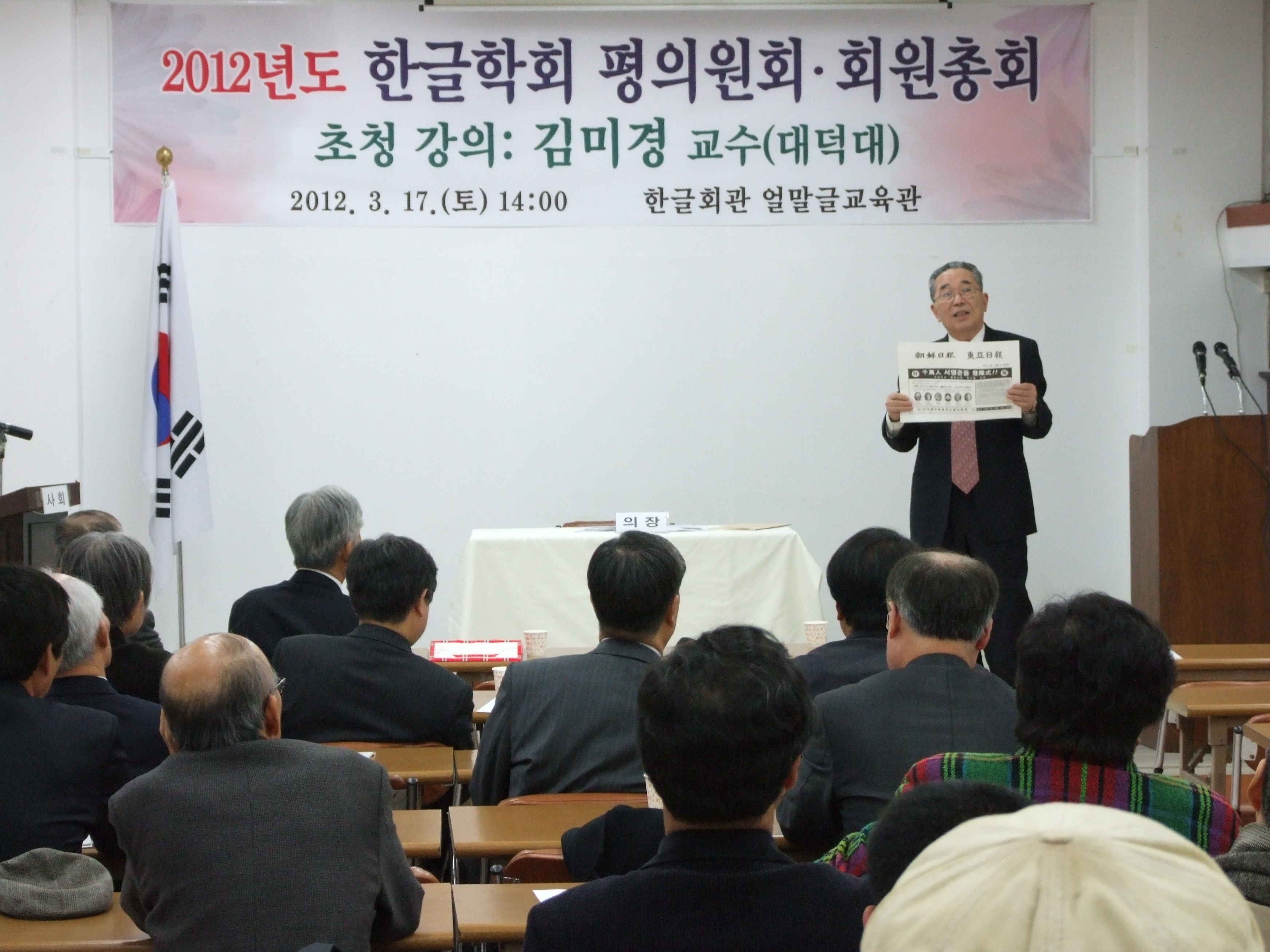 2012년 3월 17일(토) 오후 2시부터 한글회관 강당에서 열린 '2012년 한글학회 정기 평의원회/회원총회'의 자리에서 한자 관련 단체가 낸 신문광고에 대해 말씀 중이신 김종택 회장님과 정기 총회에 참석한 회원들의 모습.