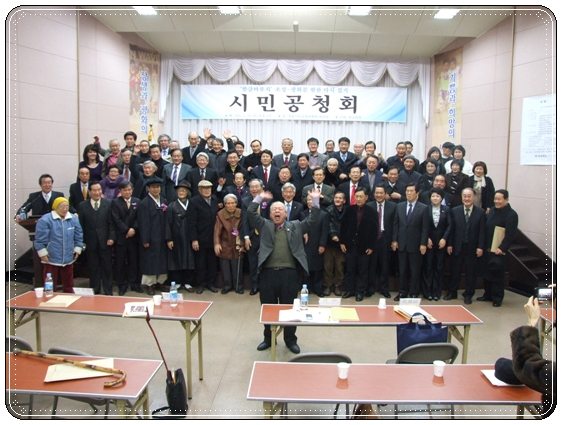 ▲ 2011년 2월 11일 오후 2시부터 서울기독교청년회관(YMCA, 종로2가) 대강당에서 열린 '한글마루지 조성/광화문 현판 다시 걸기 시민 공청회'의 모습. 만세삼창을 이끌고 있는 짚신문학회 오동춘 회장(위 사진)과 공청회에 참석한 이들의 모습(아래 사진).