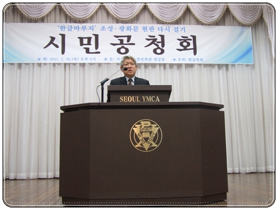 ▲ 2011년 2월 11일 오후 2시부터 서울기독교청년회관(YMCA, 종로2가) 대강당에서 열린 '한글마루지 조성/광화문 현판 다시 걸기 시민 공청회'의 모습. 3분 의견 발표를 하고 있는 김광옥 전 방송통신학회 회장(위 사진)과 이주형 한글서예가(아래 사진)의 모습.