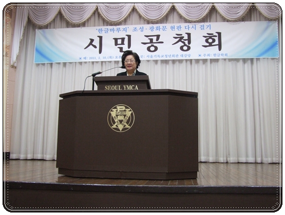 2011년 2월 11일 오후 2시부터 서울기독교청년회관(YMCA, 종로2가) 대강당에서 열린 '한글마루지 조성/광화문 현판 다시 걸기 시민 공청회'의 모습. 격려말씀을 하고 있는 박진 국회의원(위)과 김을동 국회의원(아래)의 모습.