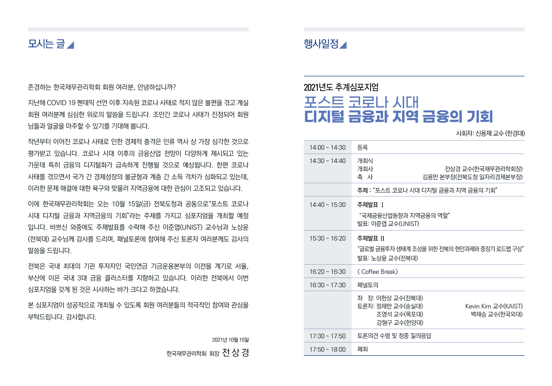 지난 안내에 공지한 바와 같이 다가오는 2021년 10월 15일(금), 전주에서 전북도청과 공동으로 “한국재무관리학회 추계 공동심포지엄”를 아래와 같이 개최됩니다.