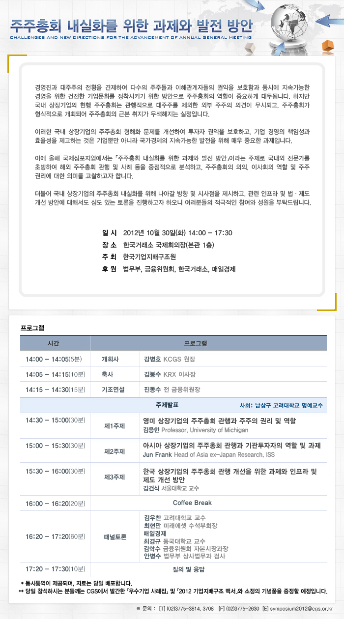 한국기업지배구조원에서 다음과 같이 「주주총회 내실화를 위한 과제와 발전 방안」이라는 주제로 “2012 CGS 국제 심포지엄”을 개최하오니 관심있는 회원님들께서는 참고하시기 바랍니다