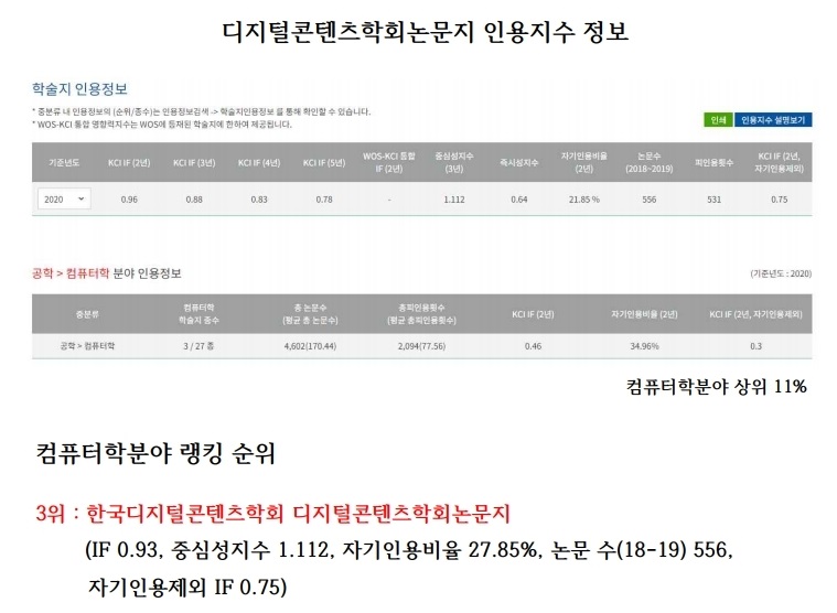 컴퓨터학 분야 학술지 총 27종 중 디지털콘텐츠학회논문지 3위