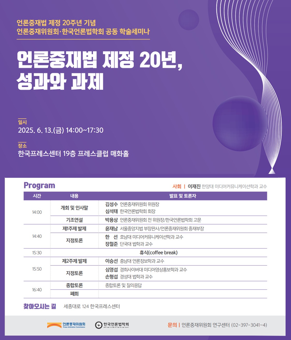 언론중재위원회와 한국언론법학회는 언론중재법 제정 20주년을 맞아 <언론중재법 제정 20년, 성과와 과제>를 주제로 아래와 같이 공동 학술 세미나를 개최합니다. 관계자 여러분들의 많은 관심과 참여를 부탁드립니다.