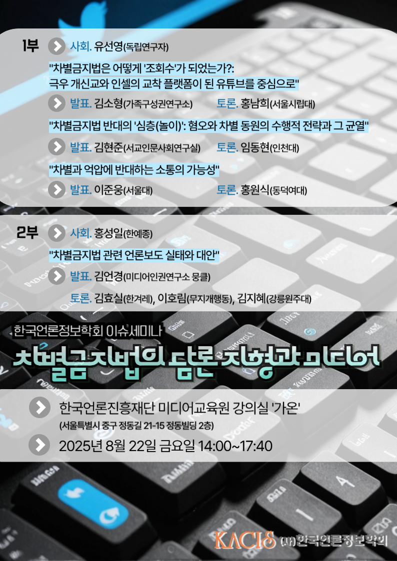 2. 한국언론정보학회는 오는 8월 22일 제4차 이슈세미나 <차별금지법의 담론 지형과 미디어>를 개최합니다. 세미나와 관련한 내용을 다음과 같이 공지합니다. 회원 여러분의 많은 관심과 참여를 부탁드립니다.