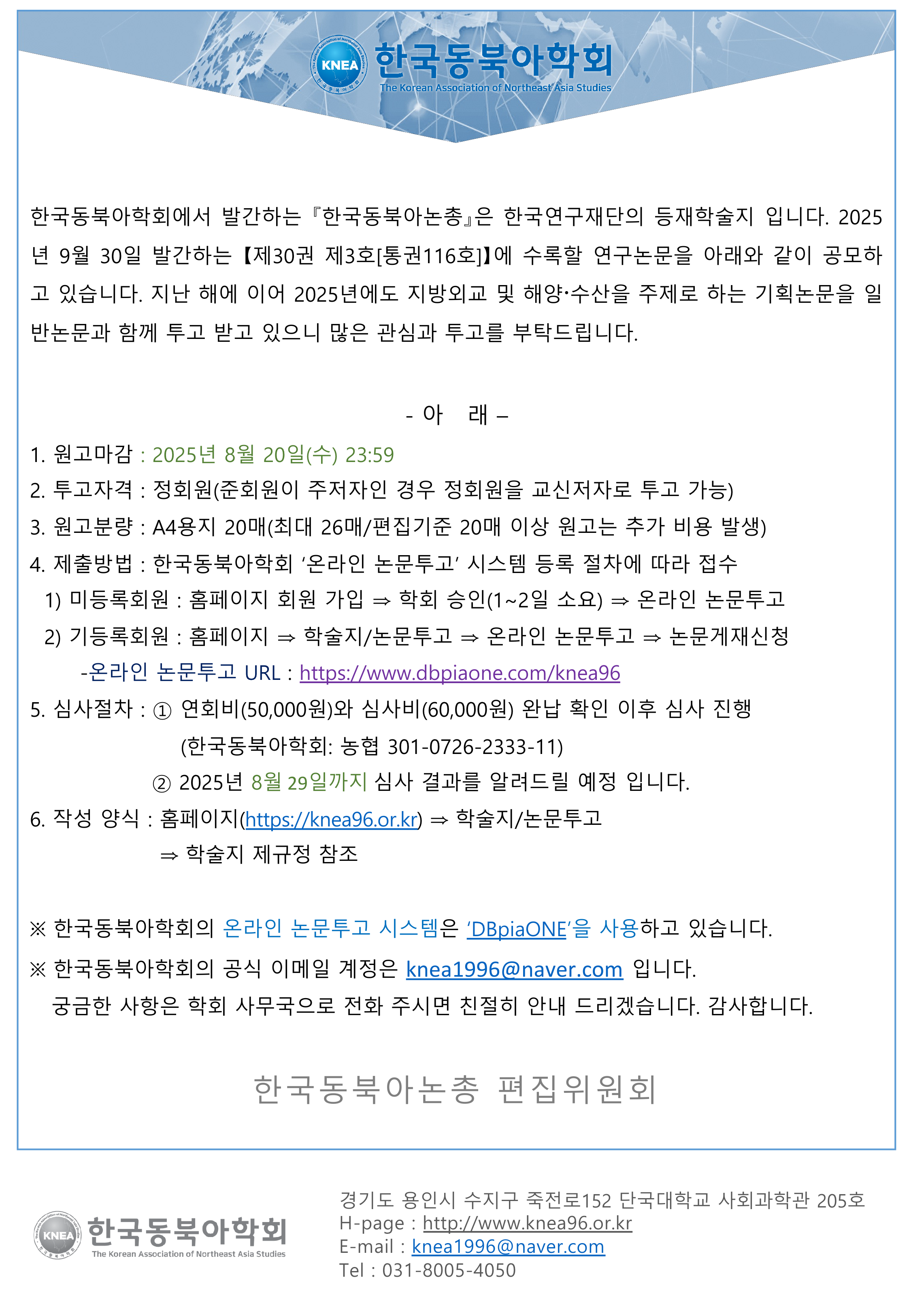 ※ 한국동북아학회의 공식 이메일 계정은 knea96@knea96.or.kr 입니다.