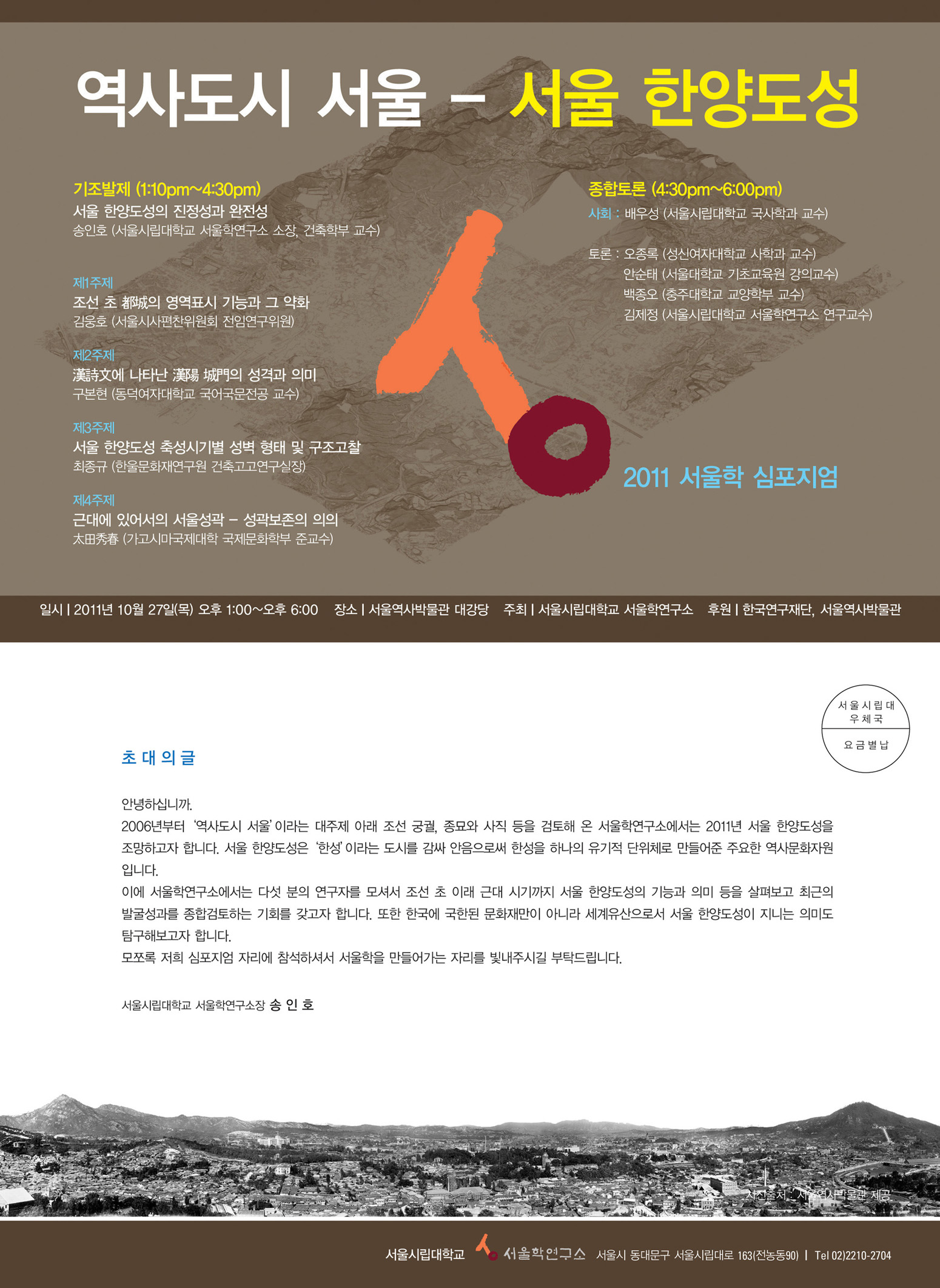 2006년부터 ‘역사도시 서울’이라는 대주제 아래 조선 궁궐, 종묘와 사직 등을 검토해 온 서울학연구소에서는 2011년 서울 한양도성을 조망하고자 합니다. 서울 한양도성은 ‘한성’이라는 도시를 감싸 안음으로써 한성을 하나의 유기적 단위체로 만들어준 주요한 역사문화자원입니다.