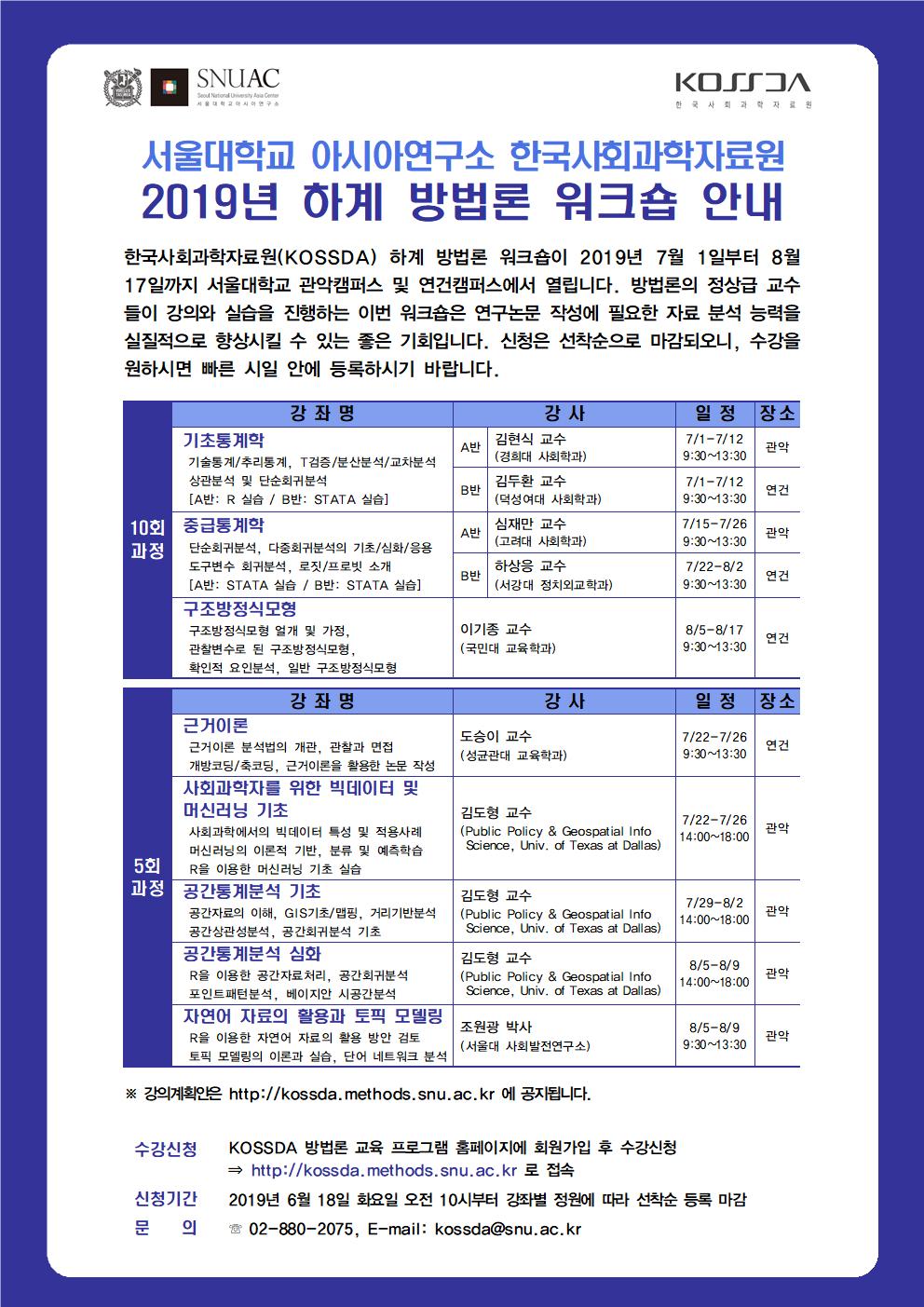 한국사회과학자료원(KOSSDA)의 하계 방법론 워크숍이 201971일부터 817일까지 서울대학교 관악캠퍼스 및 연건캠퍼스에서 열립니다. 방법론의 정상급 교수들이 강의와 실습을 진행하는 이번 워크숍은 연구논문 작성에 필요한 자료 분석 능력을 실질적으로 향상시킬 수 있는 좋은 기회입니다. 신청은 선착순으로 마감되오니, 수강을 원하시면 빠른 시일 안에 등록하시기 바랍니다.