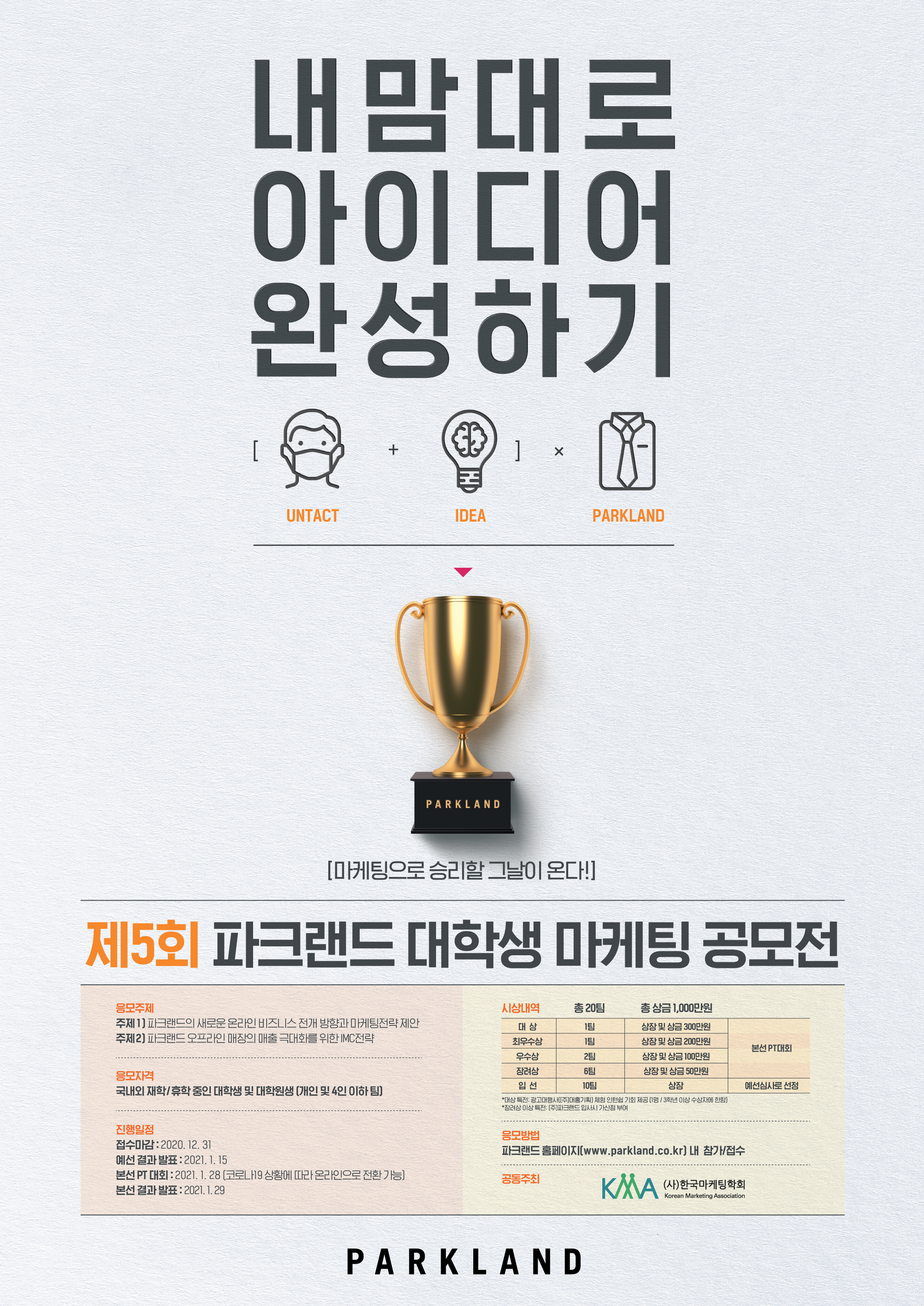 (사)한국마케팅학회와 (주)파크랜드의 공동주최로 전국 대학(원)생을 대상으로 '제5회 파크랜드 대학생 마케팅 공모전'을 개최합니다.