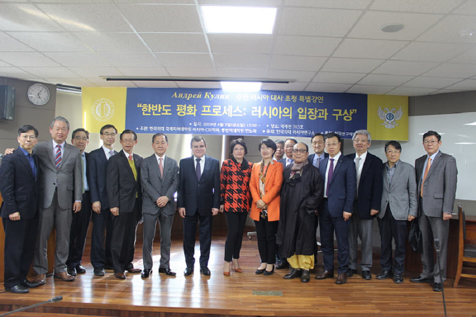 2019년  4월  5(러시아연구소는 서울캠퍼스 국제관  503호에서 안드레이 쿨릭 주한 러시아대사를 모시고  한반도 평화 프로세스 러시아의 입장과 구상 이라는 주제로 초청강연회를 개최했다 .