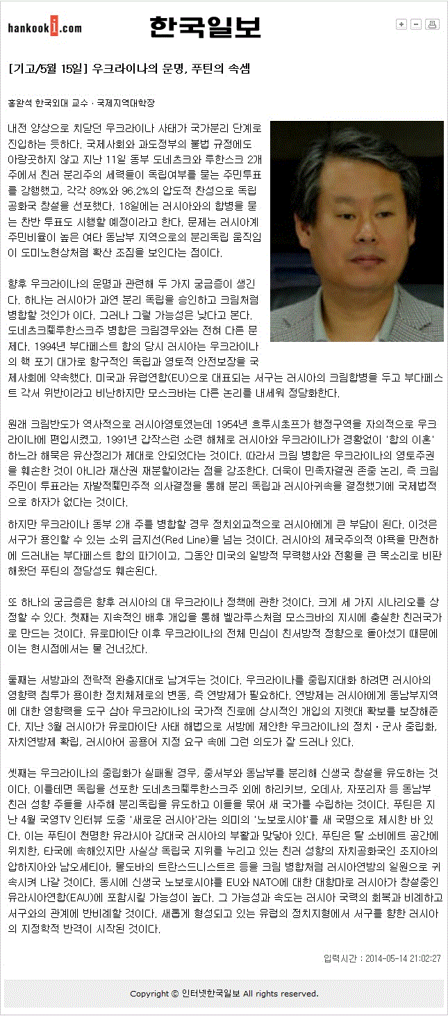 [언론보도][기고/홍완석] 우크라이나의 운명, 푸틴의 속셈 한국일보 2014.05.15