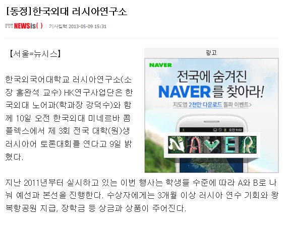 2013년 5월 10일(금) 한국외대 서울캠퍼스 미네르바 콤플렉스에서 러시아연구소(소장 홍완석 교수) HK연구사업단은 러시아 루스키 미르 재단 및 주한 러시아대사관, 주한 러시아연방 대외협력청과 공동으로 제3회 전국 대학(원)생 러시아어 토론대회를 개최했다. 전국 대학에서 신청한 응모자들을 대상으로 사전 예선을 거쳐 이번 토론대회에는 본선 진출자 16명이 최종 참가했다.