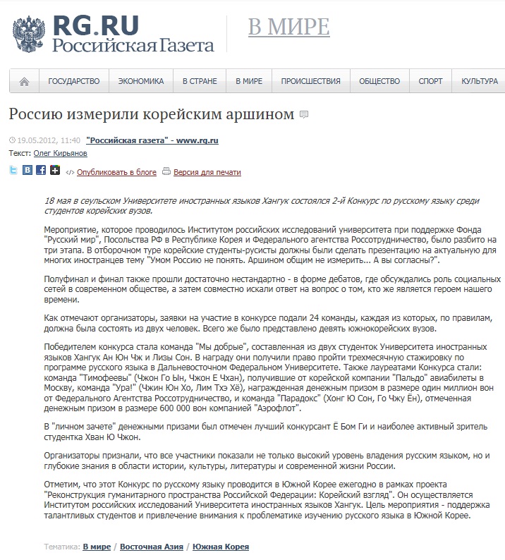 러시아 현지신문인 '로시스카야 가제타'에 실린 제2회 러시아어 토론대회 기사