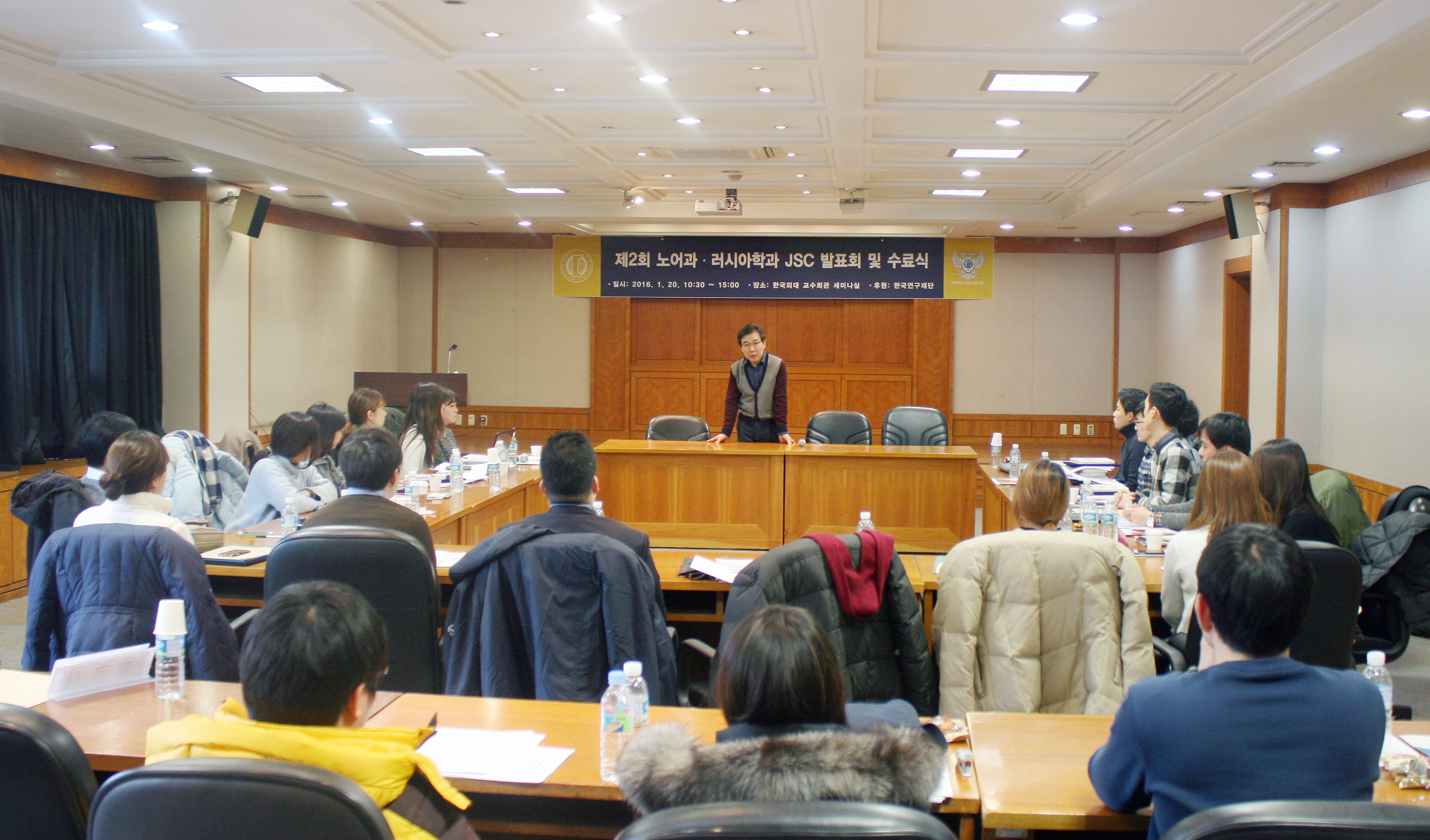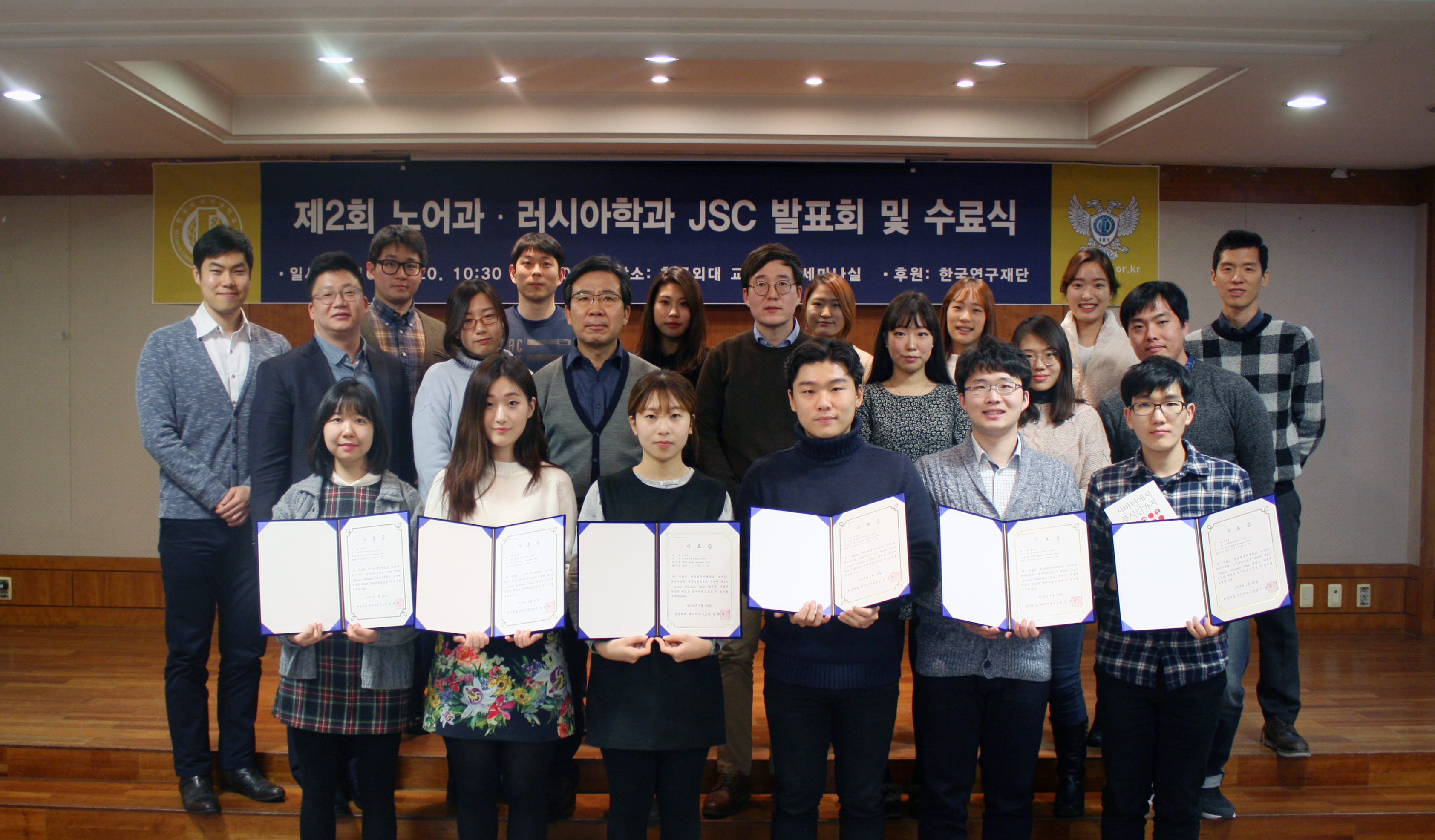 2016 년  1 월  20 ( 러시아연구소는 학문후속세대 양성 프로그램의 일환으로 제 2 회 노어과 · 러시아학과  JSC (Junior Scholars Club)  발표회 및 수료식을 개최하였다 이문캠퍼스 교수회관 강연실에서 진행된 발표회에는 김현택 러시아연구소장과 제성훈 노어과 교수 김준석  HK 연구교수 박하연 박사과정생 ( 일반대학원 등이 토론을 위해 참가하였다 총  5 개 주제 , 7 명의 발표자와  5 명의 지정토론자로 구성된 발표회는 오전  10 시  30 분에 시작하여 오후  1 시까지 진행되었다 발표회 이후에는  JSC 2 기 수료식과  2 기 멤버들의 활동 보고가 이어졌다 .