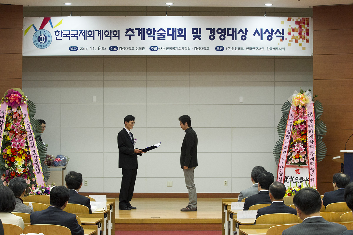 안녕하십니까? 지난 11월 8일(토) 경성대학교에서 열린 2014년 한국국제회계학회 추계학술대회 및 경영대상 시상식이 성황리에 개최되었습니다. 이번 학회는 170명이 넘는 회원님들이 참석하셔서 45의 논문을 발표해 주셨습니다. 바쁘신 와중에도 먼 길을 마다하지 않으시고 참석해 주신 회원분들과 멀리서 관심 가져주신 모든 분들께 감사드립니다. 앞으로도 학회발전을 위해 많은 관심 부탁드립니다.