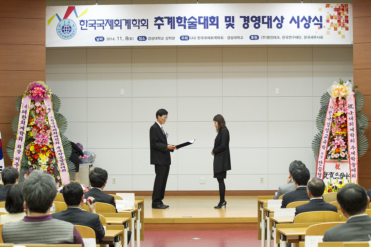 안녕하십니까? 지난 11월 8일(토) 경성대학교에서 열린 2014년 한국국제회계학회 추계학술대회 및 경영대상 시상식이 성황리에 개최되었습니다. 이번 학회는 170명이 넘는 회원님들이 참석하셔서 45의 논문을 발표해 주셨습니다. 바쁘신 와중에도 먼 길을 마다하지 않으시고 참석해 주신 회원분들과 멀리서 관심 가져주신 모든 분들께 감사드립니다. 앞으로도 학회발전을 위해 많은 관심 부탁드립니다.