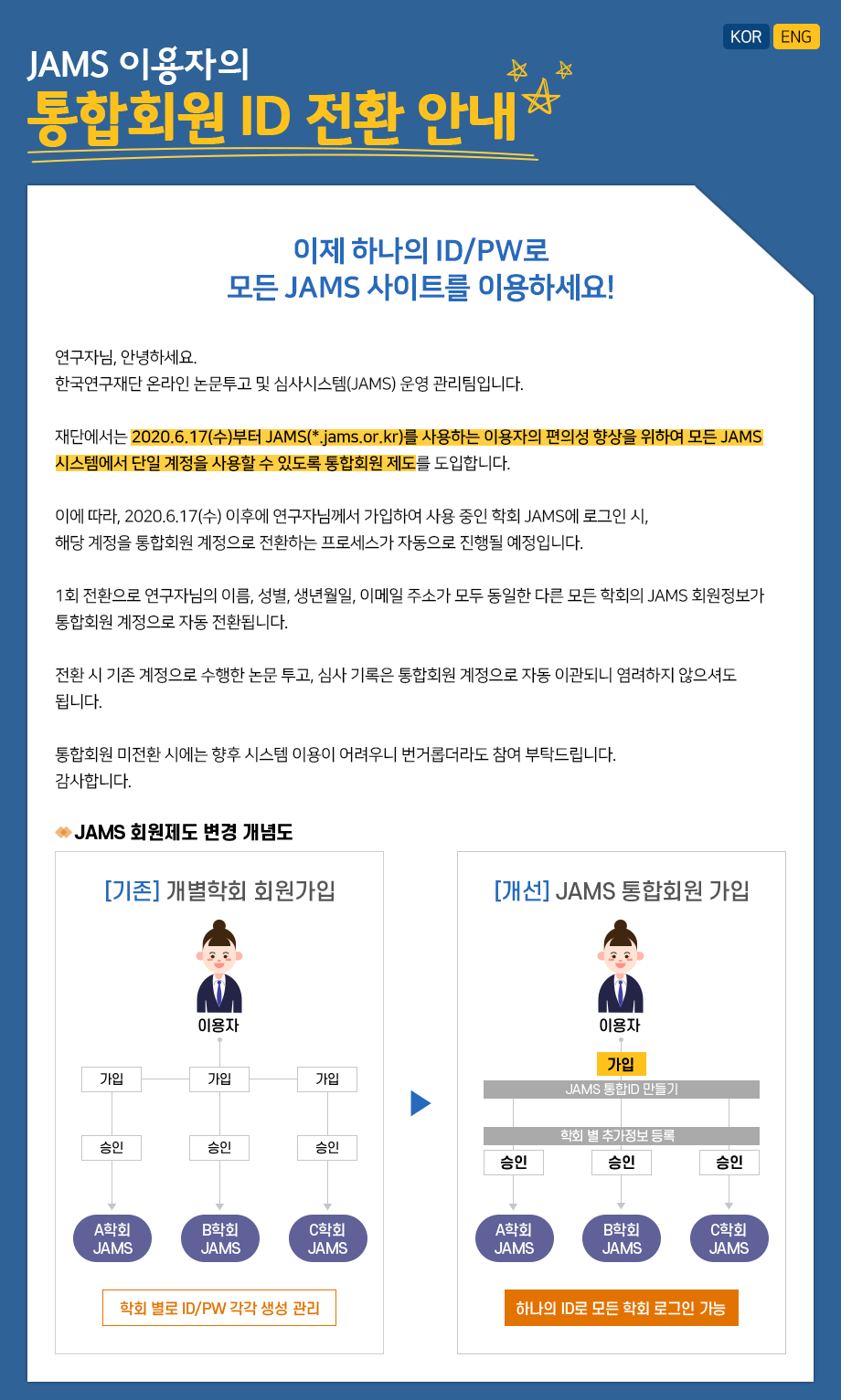 앞으로 하나의 계정(ID/PW)으로 모든 JAMS 시스템에 로그인하실 수 있도록 통합회원 제도를 도입하려 합니다.