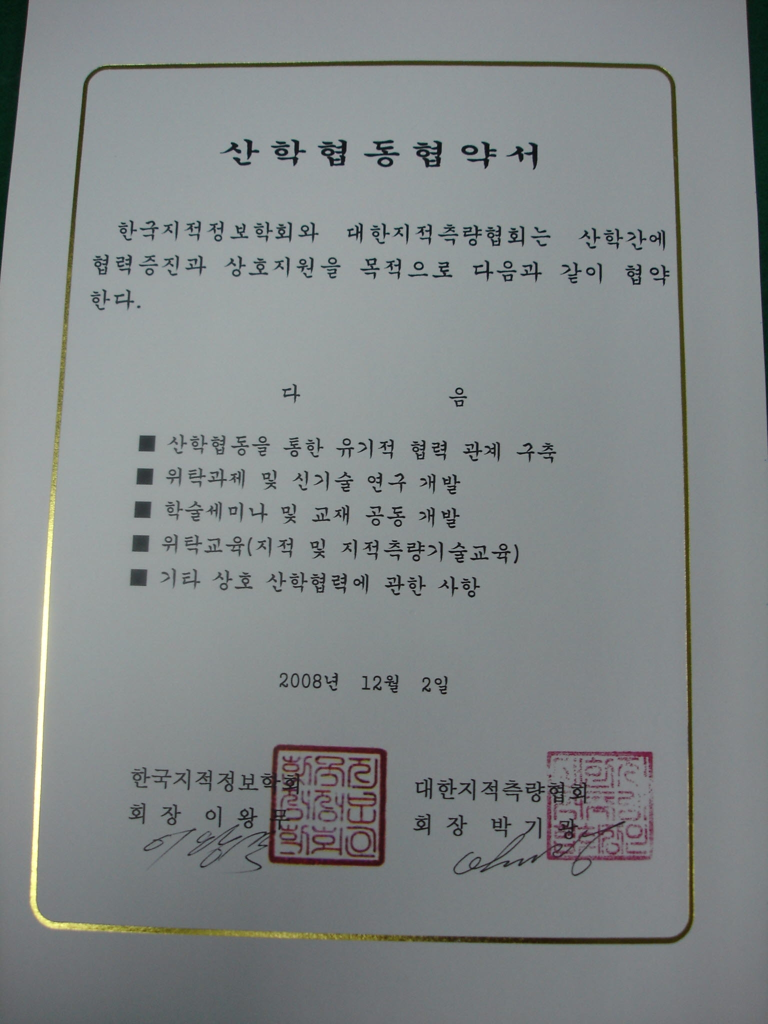 2008년 12월 2일, 한국지적정보학회(회장 이왕무)와 대한지적측량협회(대표 박기광)간에 산학협력 협약을 체결하였습니다..