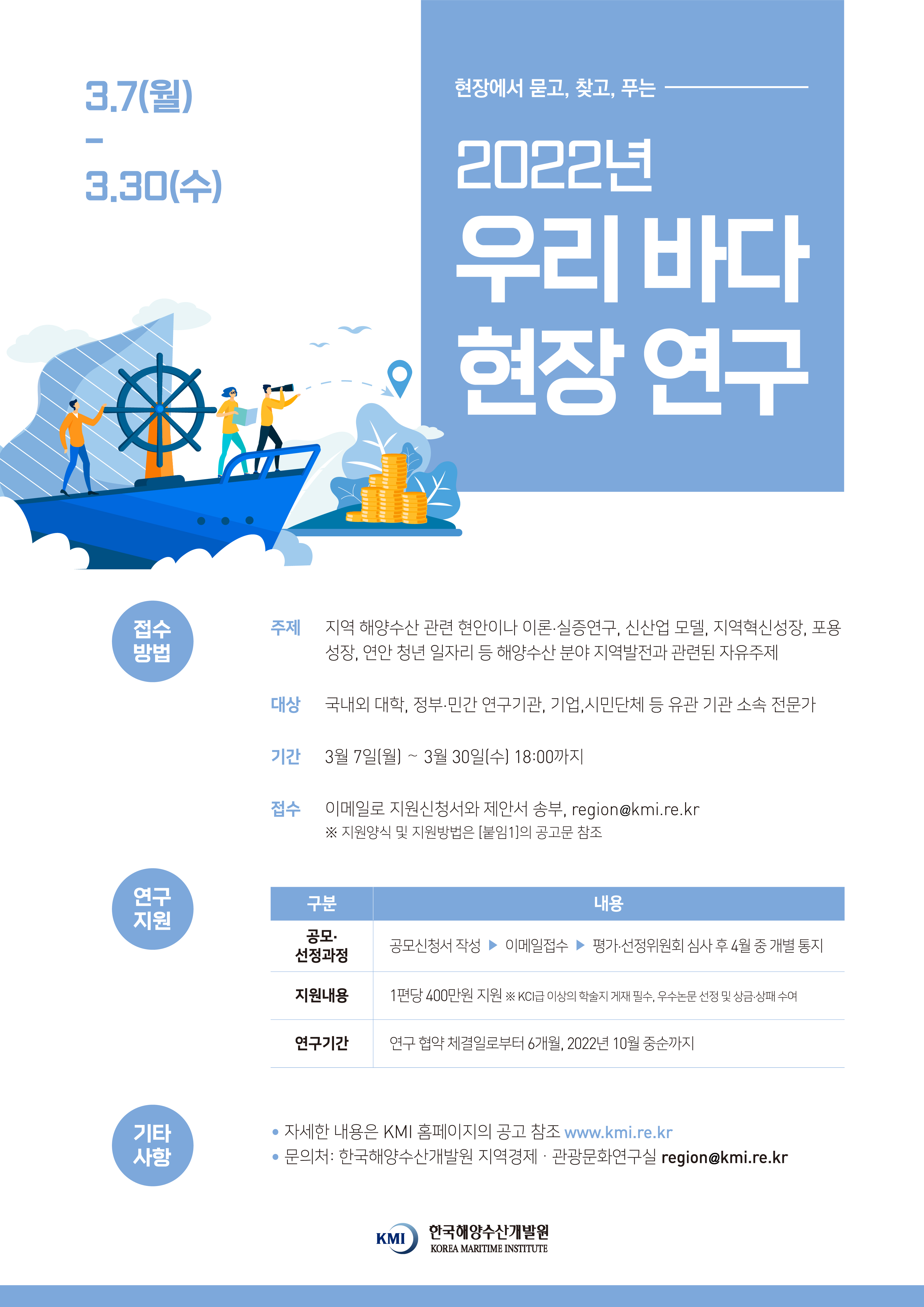 한국해양수산개발원은 연안·해양 지역발전을 위한 창의적이고 실용적인 연구를 지원하는 [2022년 우리 바다 현장 연구] 공모를 아래와 같이 진행 중에 있습니다.