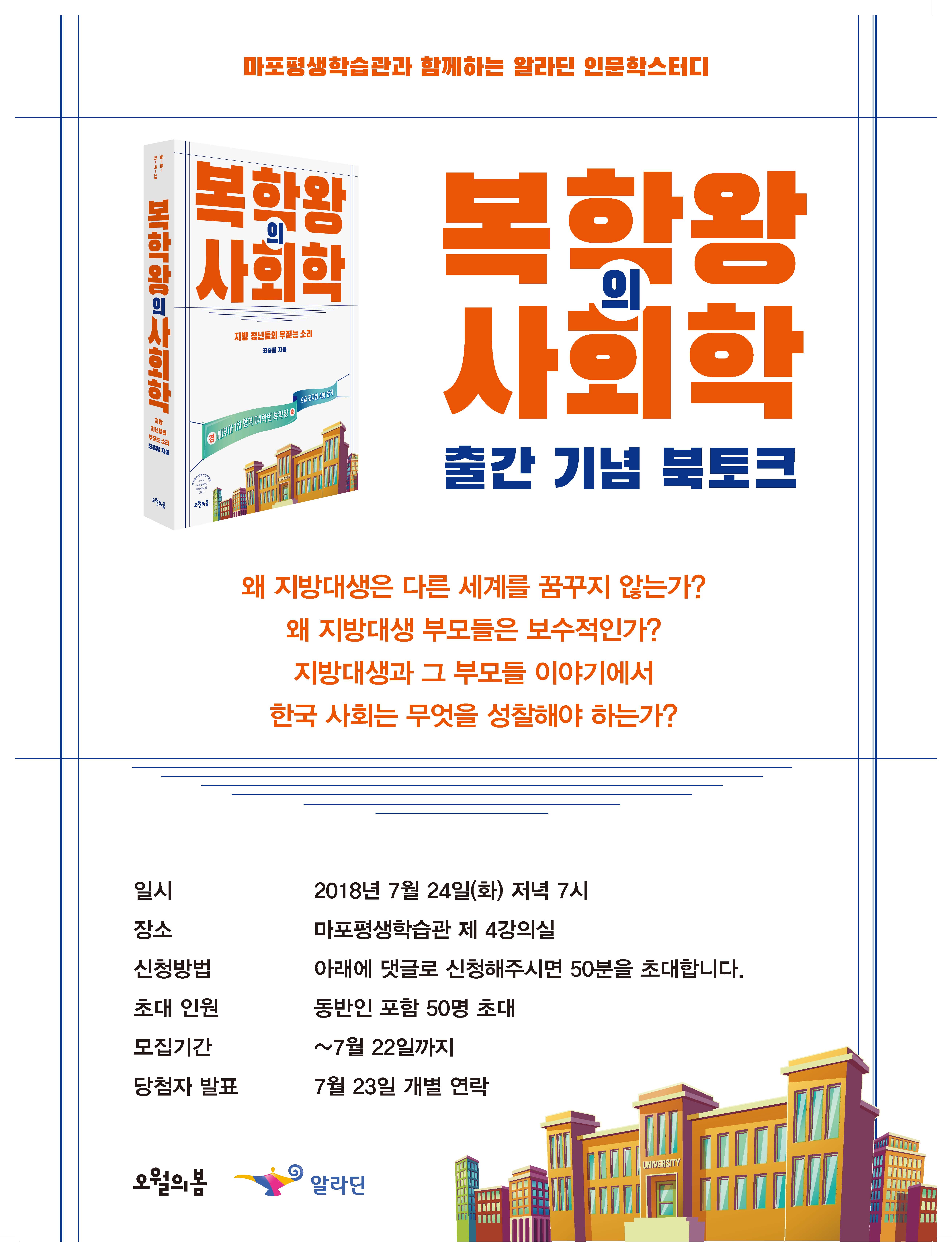 한국문화사회학회 최종렬 부회장님께서 신간 <복학왕의 사회학> 출간 기념 북콘서트를 여십니다.