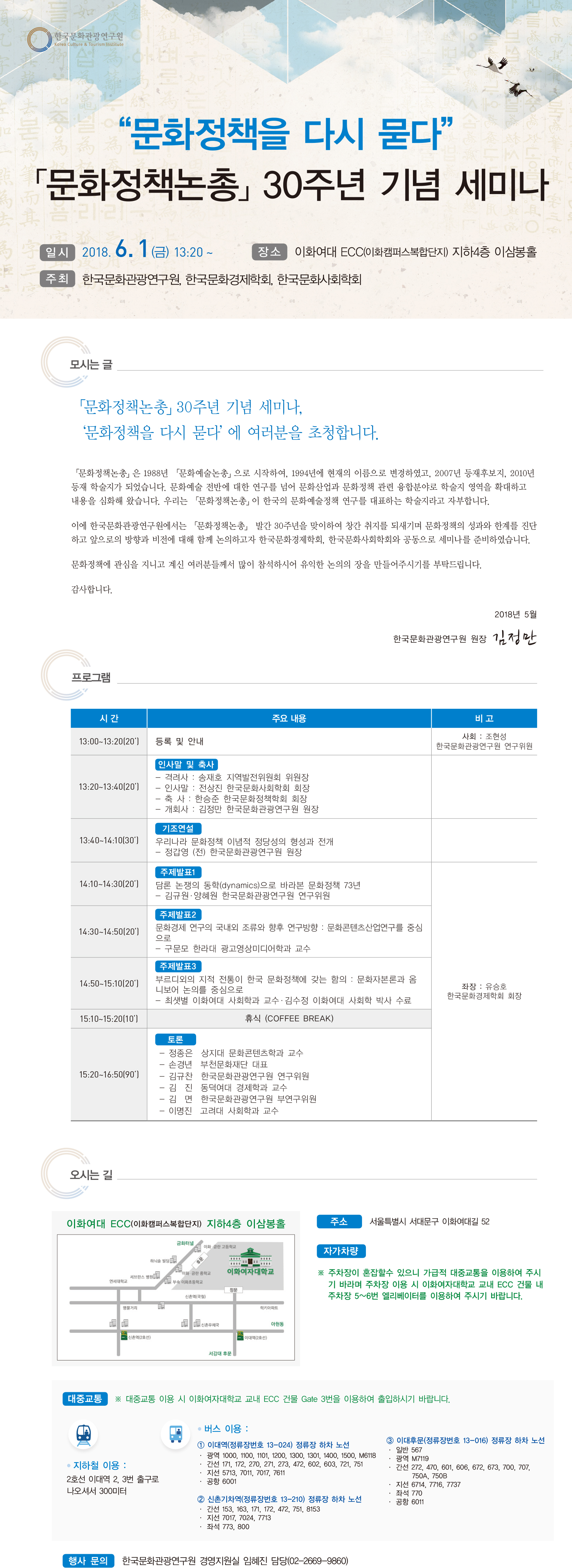 한국문화관광연구원, 한국문화사회학회, 한국문화경제학회 공동주최 <문화정책논총> 30주년 기념 세미나 (6월 1일)