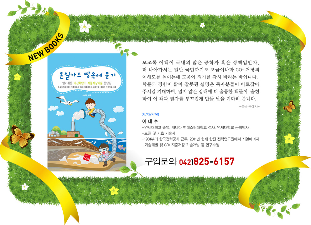 오름디자인기획의 신간을 소개합니다. '온실가스 땅속에 묻기' 라는 신간을 소개합니다. ISBN 978-89-956796-5-4 저자 : 이대수 -연세대학교 졸업 -캐나다 맥매스터대학교 석사 -연세대학교 공학박사 -토질 및 기초 기술사-1981부터 한국전력공사 근무 -2011년 현재 한전 전력연구원에서 지열에너지 기술개발 및 C02 지중저장 기술개발 등 연구수행 '-저자의 말-모쪼록 이책이 국내의 많은 공학자 혹은 정책임안자, 더 나아가서는 일반 국민까지도 조금이나마 CO2 저장의 이해도를 높이는데 도움이 되기를 감히 바라는 바이다. 학문과 경험이 짧아 잘못된 설명은 독자분들이 바로잡아 주시길 기대하며, 멀지 않은 장래에 더 훌륭한 책들이 출현하여 이 책과 필자를 부끄럽게 만들 날을 기다려 본다.' 글의 내용 Ⅰ. 기본 상식편 문 1) CO2는 인간에게 무엇인가? 문 2) CO2의 누출시 생태계에 어떠한 영향을 미치는가? 문 3) CO2는 왜 처분해야 하나? 문 4) CO2의 저장방식에는 어떠한 것이 있는가? 문 5) 지중에 저장되는 CO2는 기체인가 혹은 액체인가? 문 6) CO2는 법적으로 폐기물인가? 문 7) CO2 저장부지로 적합하려면 어떠한 특성을 가져야 하는가? 문 8) 우리나라에 CO2 지중저장이 가능한 부지는 존재하는가? 문 9) 지중에 저장된 CO2는 어떠한 변화를 겪는가? 문 10) 지중에 저장된 CO2는 안전하게 보관되는가? 문 11) CO2 지중저장시 어떠한 감시방법이 사용되는가? 문 12) CO2 누출시 어떠한 방법으로 보수할 수 있나? 문 13) 저장부지의 법적 소유권은 누가 갖는가? 문 14) 국내의 연구개발 동향은? 문 15) 국내의 관련 기술수준은? 문 16) 가장 중요한 기술과 어려운 기술은? 문 17) 해외의 연구개발 동향은? 문 18) 우리나라 정부의 지중저장 계획은? 문 19) 우리나라가 가입한 지중저장 관련 국제기구는? 문 20) 지중저장 사업의 소요기간은? 문 21) 지중저장의 경제성과 사업성은? Ⅱ. 전문 지식편 문 22) 저장부지의 공학적 선정기준은? 문 23) 저장부지의 저장용량 산정법은? 문 24) 해외의 대규모 CO2 지중저장사업과 부지의 특징은? 문 25) 해외의 CO2 지중저장 사업중 특히 관심을 가질만한 것은? 문 26) CO2 압축시 고려사항은? 문 27) CO2 수송용 배관설계시 고려사항은? 문 28) CO2를 선박으로 수송시 주의점은? 문 29) 주입정 굴착시 주의사항은? 문 30) CO2를 주입정을 통하여 주입시 고려사항은? 문 31) 지중에서의 CO2 확산거동을 예측하는 방법은? 문 32) 저장부지의 유지관리는 어떻게 이루어지는가? 문 33) 지중저장시 모니터링 기법의 구체적 내용? 문 34) 저장시설의 폐쇄절차는? 문 35) 환경영향평가는 어떻게 수행되는가 문 36) 지중저장된 CO2의 누출 위험은 어떻게 평가하는가? 불쑥 메일을 드려 죄송합니다. 연구에 도움이 되면 좋겠습니다. 감사합니다. 자세한 도서문의 : 오름디자인 042-825-6157 Email:add3969@hanmail.net 010-4290-3969