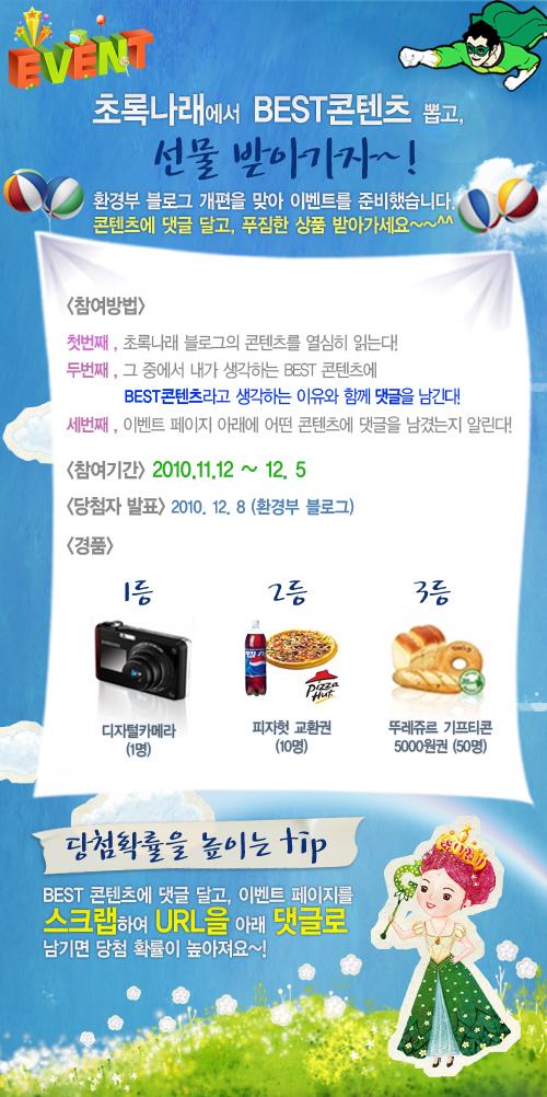 [Event] 초록나래에서 BEST 콘텐츠 뽑고, 선물 받아가자~! 환경부 블로그 개편을 맞아 이벤트를 준비했습니다. 콘텐츠에 댓글 달고, 푸짐한 상품 받아가세요~^^ - 참여기간 2010.11.12 ~ 12.5 - 당첨자 발표 2010.12.8(환경부 블로그) - 상품 1등 디지털카메라(1명) 2등 피자헛 교환권(10명) 3등 뚜레쥬르 기프티콘 5,000원권(50명) * 이벤트 페이지는 스크랩하면 당첨 확률이 높아져요~! http://blog.daum.net/mepr_greenwing/7632775