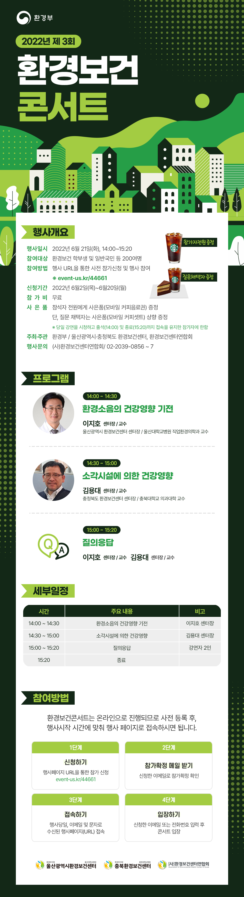환경부에서 환경보건전문가들과 함께 환경보건 관련 전공 학생 및 일반 국민을 대상으로 환경보건에 관한 강연과 더불어 참여자들과 질문·답변의 시간을 갖는환경보건콘서트 개최하고자 하오니 적극 참여하시어 환경보건에 관한 정보 교류의 장이 되실 수 있기를 희망합니다.