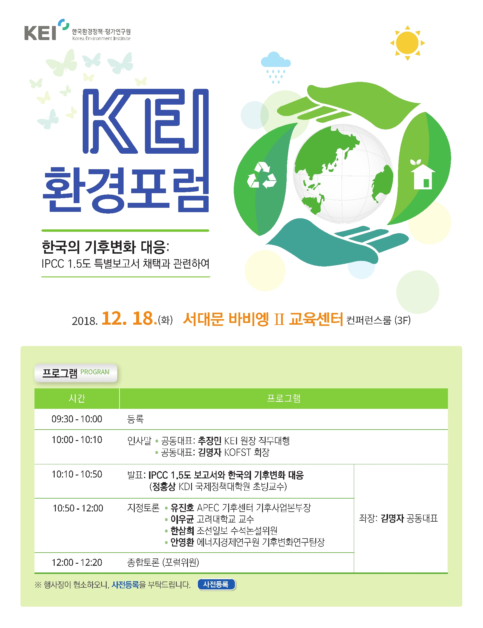 KEI에서는 오는 12월 18일(화) 10시, 서울 서대문 바비엥Ⅱ 교육센터 컨퍼런스룸(3층)에서 'KEI 환경포럼'을 개최합니다.