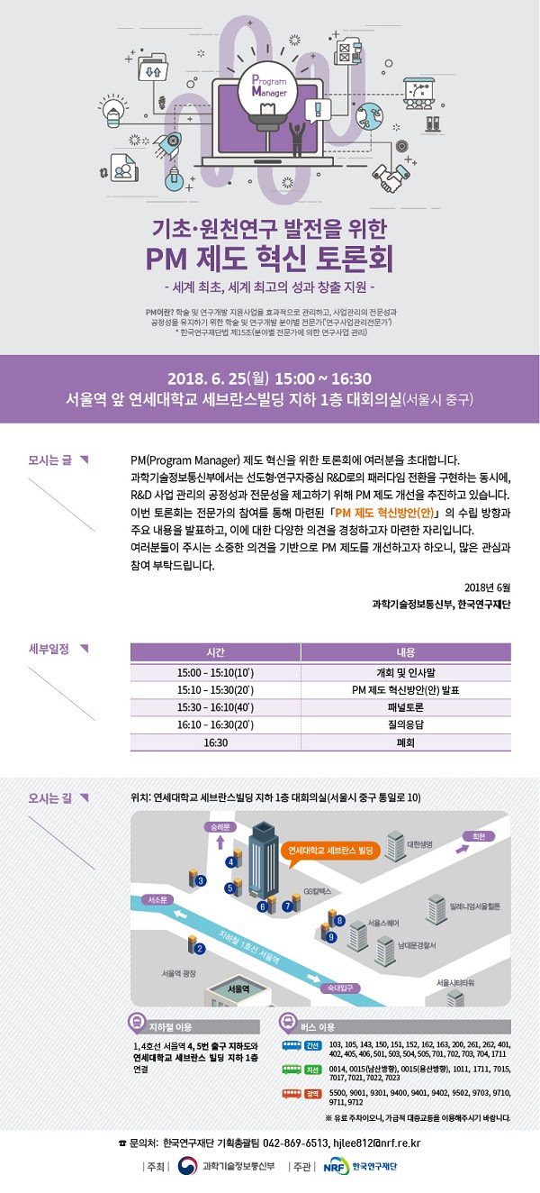 | 과학기술정보통신부와 우리 재단은 기초·원천연구 발전을 위한 PM 제도 혁신 토론회를 개최하여 PM 제도 혁신방안(안)에 대한 의견수렴을 하고자 합니다. ❖ PM이란? 학술 및 연구개발 지원사업을 효과적으로 관리하고, 사업관리의 전문성과 공정성을 유지하기 위한 학술 및 연구개발 분야별 전문가('연구사업관리전문가') ■ 일시 : 2018.6.25.(월) 15:00 ~ 16:30 ■ 장소 : 서울역 앞 연세 세브란스빌딩 지하 1층 대회의실(서울시 중구) ■ 내용 : PM 제도 혁신방안(안) 발표 및 패널토론/질의응답 |