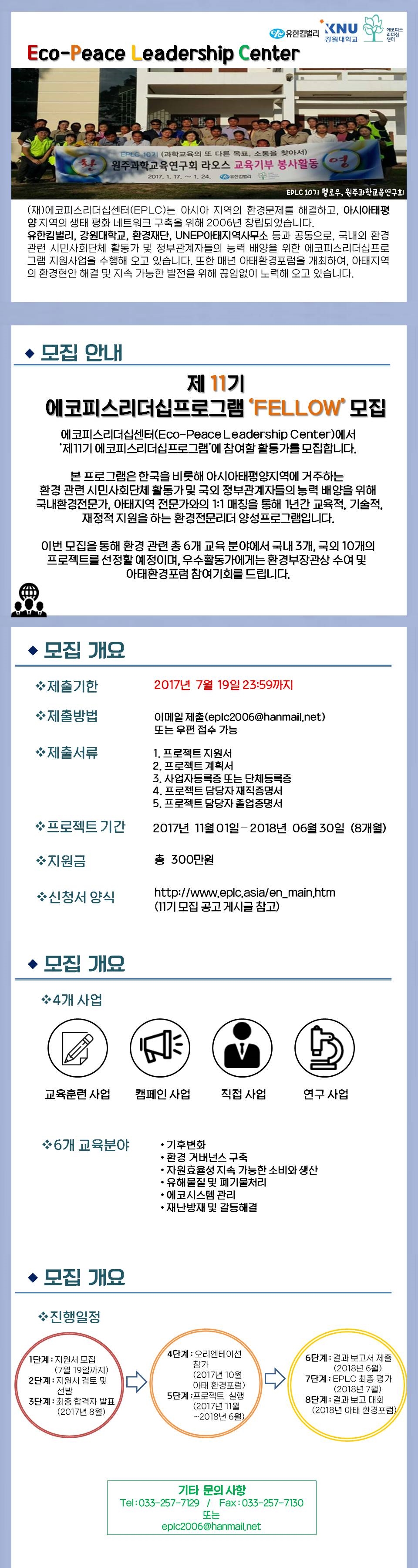 아시아지역의 환경문제 해결 및 아시아태평양 지역의 생태 평화 네트워크의 구축을 위해 설립된 (재)에코피스리더십센터(EPLC)에서 2017년 ‘제11기 에코피스리더십프로그램 지원사업’을 공고하고자 합니다.