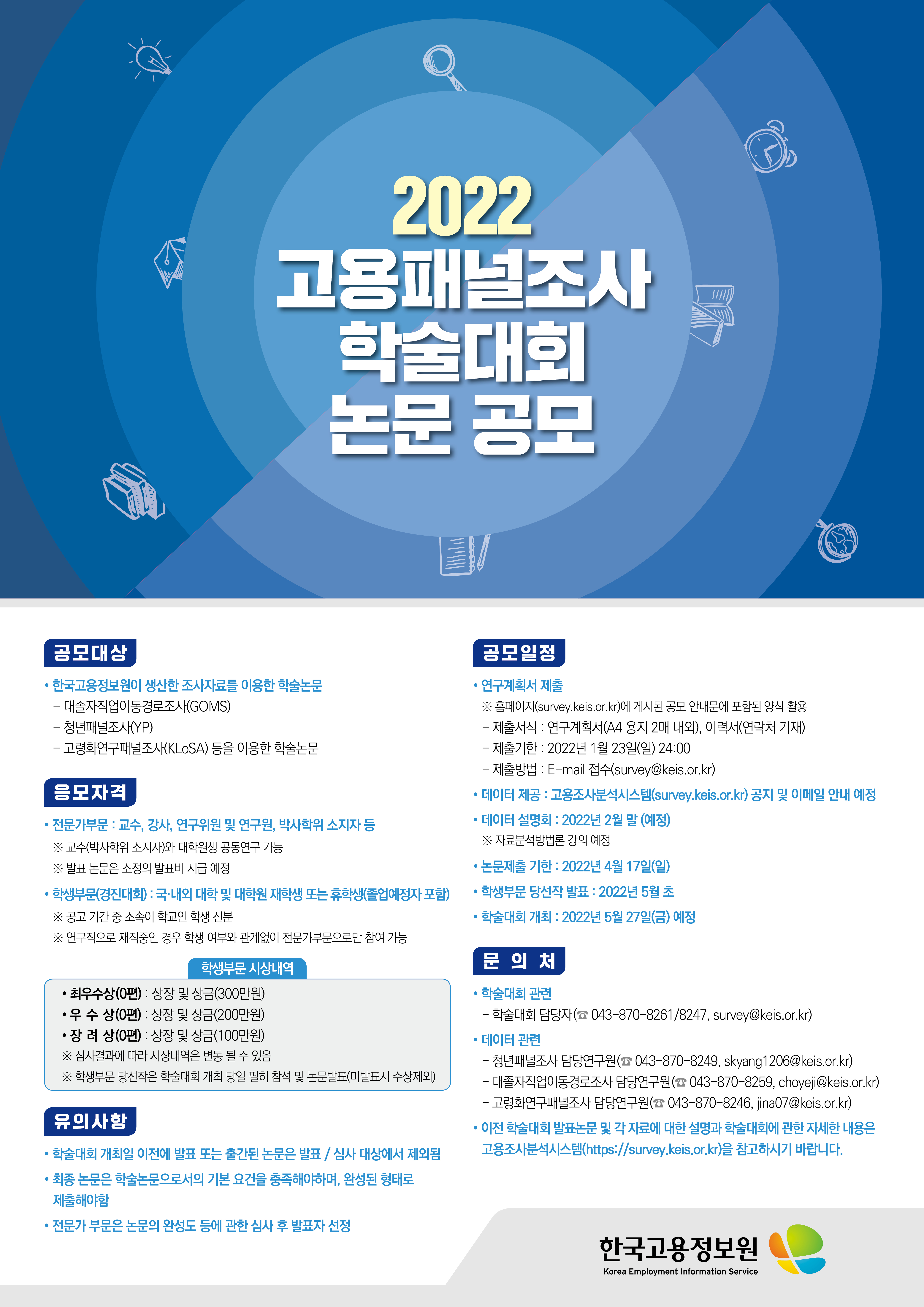 ※ 자세한 사항은 첨부파일 「2022 고용패널조사 학술대회」 논문 공모 안내(연구계획서 포함) 및 「2022 고용패널조사 학술대회」 논문 공모 안내 포스터를 참조 부탁드립니다. |
